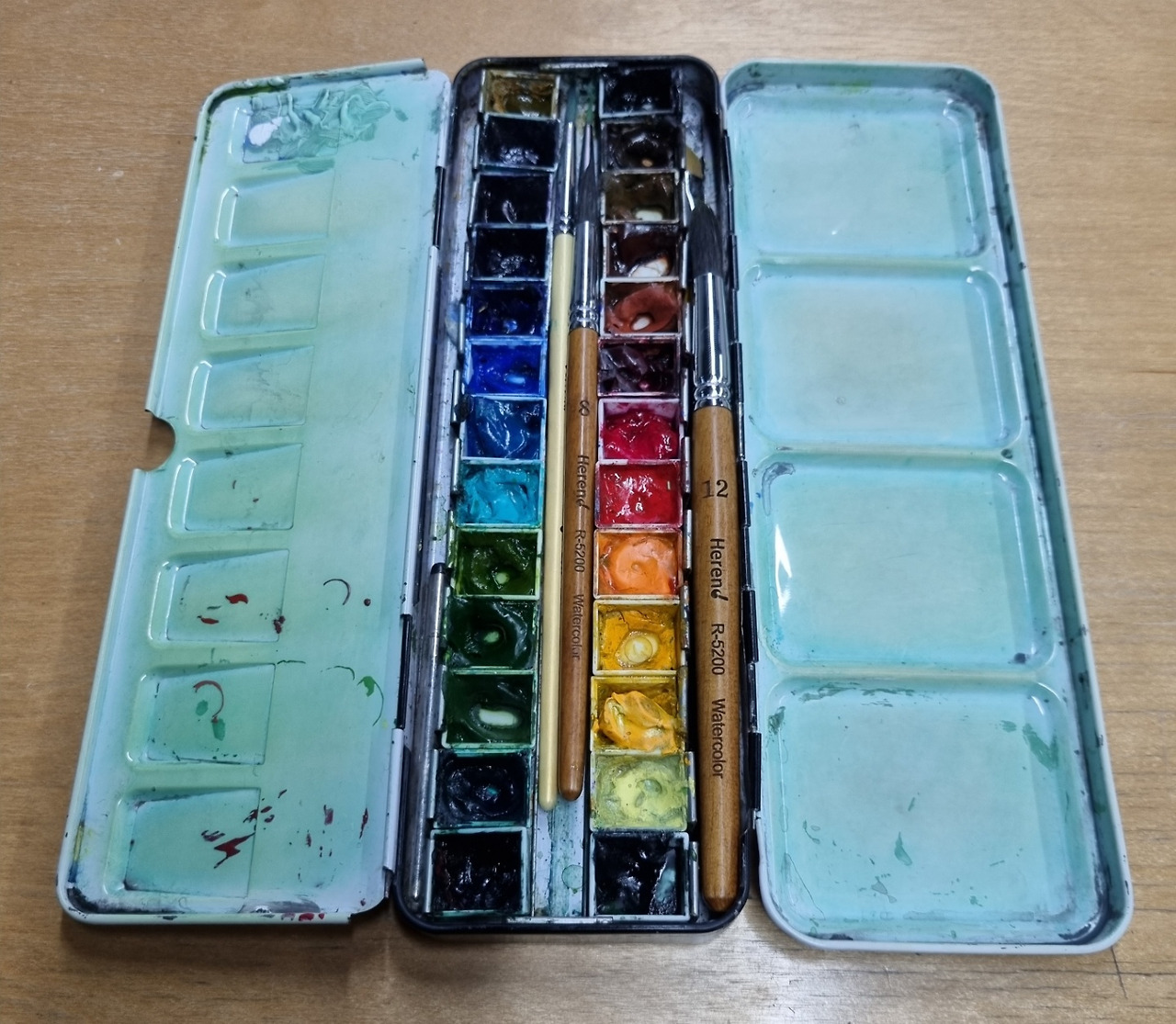 [좌] 12색 문교팔레트의 칸을 제거하고 21색으로 채워 사용한 두번째 팔레트 [우] 지금은 24색 문교팔레트에 붓을 넣고 다닙니다