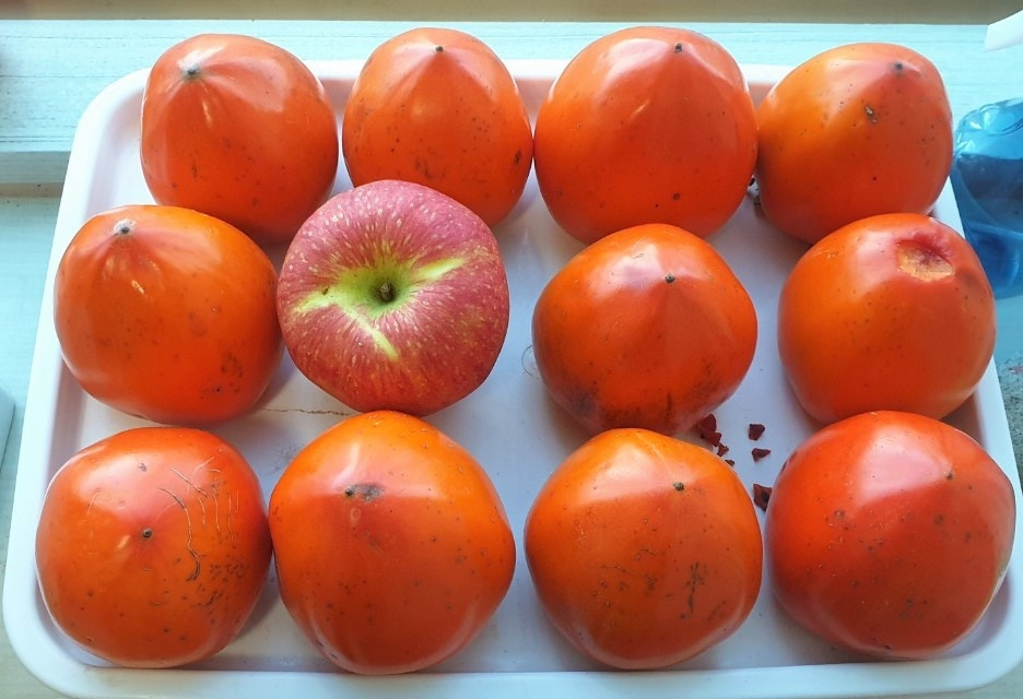 인터넷을 찾아보니 감 다섯 개 정도에 사과 하나를 옆에 두면 에틸렌 가스가 나와 좀 더 잘 익는다고 한다. 마침 냉장고에 사과가 있어 냉큼 꺼내 감 사이에 두었다. 숨은 그림 찾기처럼 느껴진다. "과일 속 숨어 있는 가을을 찾으세요." 뭐라 말할 수 없고 꼭 집어 어딘지 알 수도 없지만 분명 가을이 보인다. 익어가며 스며드는 과일의 단맛은 설탕과 달리 깊이가 있다. 그 속에 가을이 있고 없고의 차이는 아닐까.