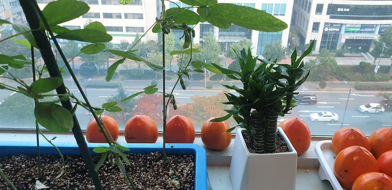 대봉감 옆에 콩도 열심히 익어가고 있다. 이제 제법 콩꼬투리가 갈색으로 변했다. 아직 솜털이 보송한 꼬투리도 있어 수확의 시기를 늦추고 있을 뿐이다. 콩도 감도 열심히 가을을 마신다. 감 혼자보다는 사과와 함께인 것이 낫고 과일만 있는 것보다는 옆에 콩 화분이 있는 것이 더 낫다. 여럿이 모여 조금씩 뻗어 나오는 햇살을 받는다. 제법 차가워진 새벽바람이 성가시지 않고 반가운 것은 내 옆에 곶감으로 변신할 대봉감이 있기 때문이다.