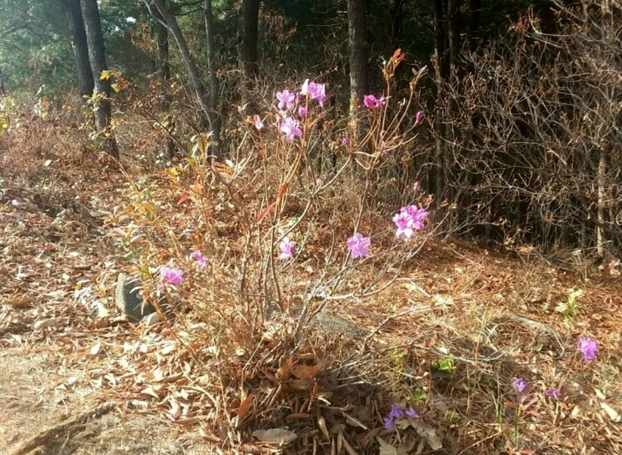 한참을 올라가니 계절을 착각한 진달래꽃이 피어 있었다. 주변에는 잎이 다 떨어진 앙상한 나무들이 제법 많았는데 꽃은 홀로 봄인 듯했다. 우리는 신기해서 꽃을 관찰했다. 진달래와 철쭉의 차이를 머리를 맞대고 찾았다. 우자는 꽃이 먼저 피고 잎이 나는 것이 진달래이고 꽃과 잎이 같이 나는 것이 철쭉이라 했다. 그러고 보니 진달래꽃이 달린 가지에 나뭇잎이 하나도 없었다. 진달래는 먹을 수 있으니 먹어도 된다는 말에 한 학생이 냉큼 맛을 봤다. 맛있는 듯 표정을 지으며 나를 보았지만 나는 먹지 않았다. 여러 번 속아 본 자의 합리적인 의심이었다. 우린 같이 웃고 다시 산행을 시작했다.