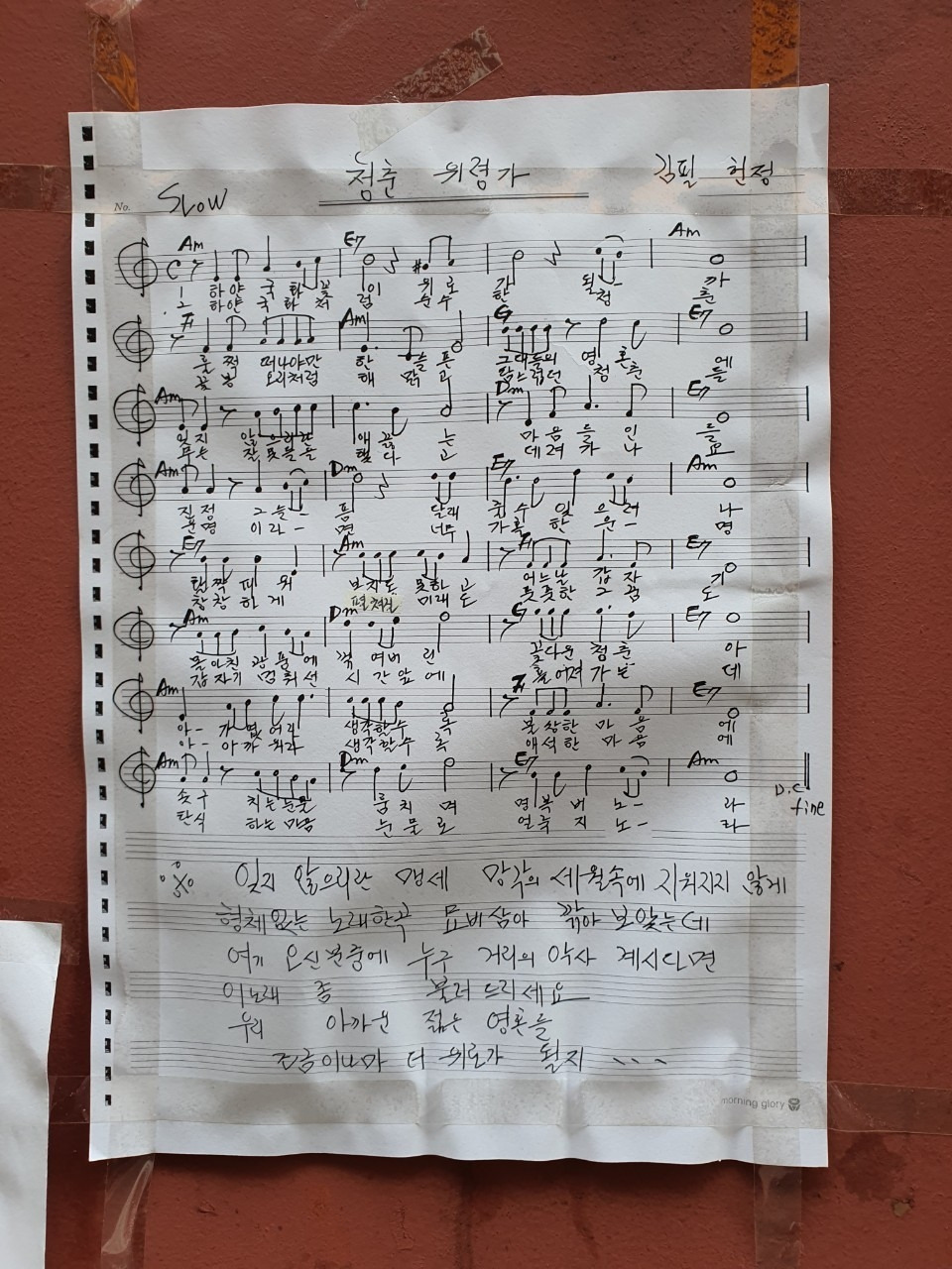 학생들과 함께 이태원도 걸었다. 10.29. 참사 현장을 찾아봐야 한다는 학생들의 의견에 따라서였다. 골목은 나를 포함한 5명이 들어갔을 뿐인데도 제법 찼다. 이곳에 그렇게 많은 사람들이 있었다는 것이 믿기지가 않았다. 직접 보고도 믿을 수 없는 것을 어떻게 받아들여야 할지 몰라 당황스러웠다. 골목을 걷고 또 걸었다. 이태원의 모든 골목은 좁고 짧았다. 그렇게 많은 사람들을 수용할 수 있는 장소가 아니었다. 길을 걸으며 벽에 붙어 있는 수많은 글들을 읽었다. 그들의 슬픔을 다 이해하지 못해 미안했다. 그날 하루닫기에서 한 학생이 슬퍼하기도 바빠 공감할 수 없었다고 했다. 그 말이 무슨 뜻인지 알 것 같았다. 가수 김필은 '청춘 위령가'를 만들어 헌정했다. 나는 이 곡의 악보를 글과 함께 올린다. 크게 영향력 없는 글이지만 작게나마 보탬이 됐으면 좋겠다는 마음을 담는다. 작은 기억이 모여 힘이 생길 것이다. 꼭 그럴 거라 믿는다.