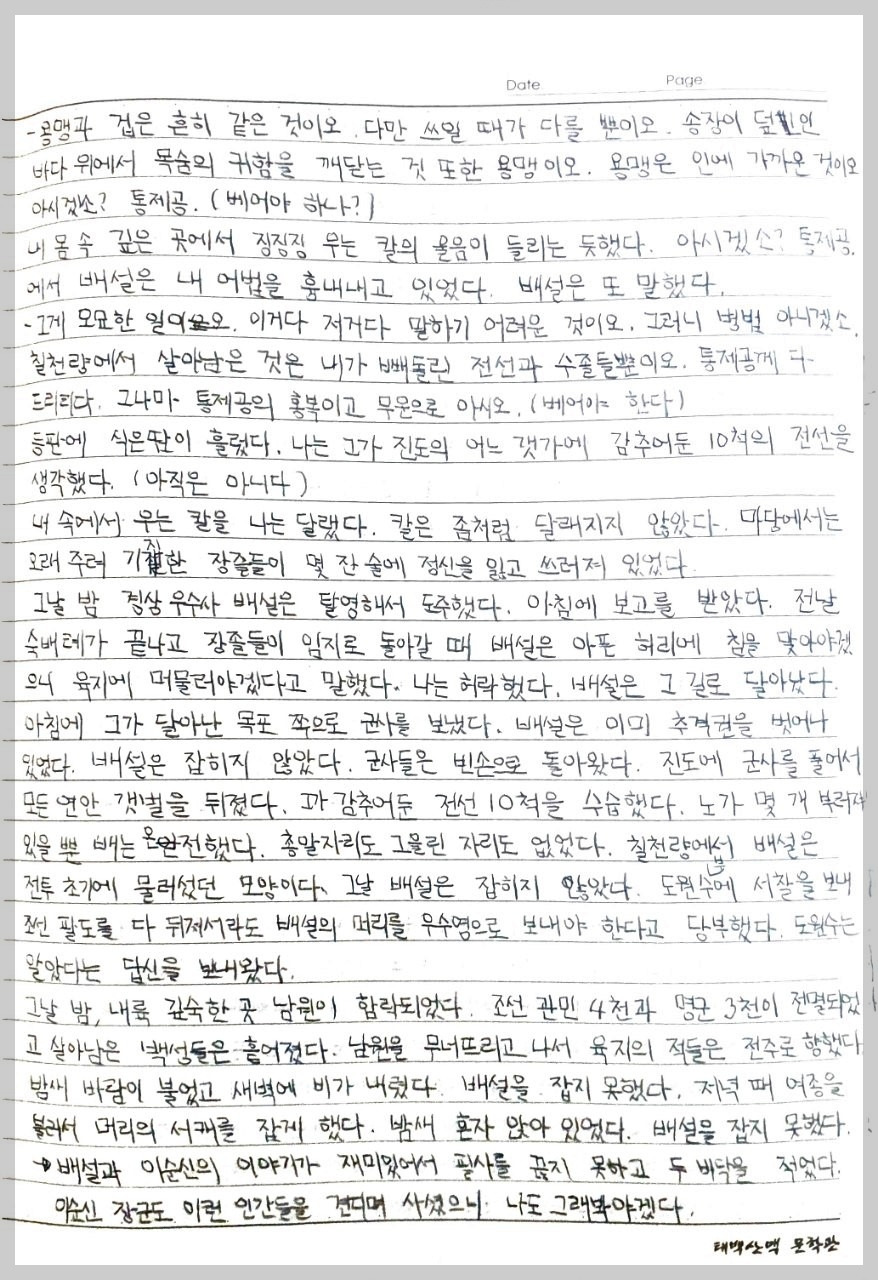 나는 지금 이순신 장군이 부르는 칼의 노래를 내 속도에 맞게 조절하며 듣고 있는 중이다. 쓰는 행위는 읽는 것보다 시간이 많이 걸린다. 느리게 진행될 수밖에 없는 필사의 시간은 책 속에 담긴 이야기를 느리게 그리고 좀 더 깊이 받아들일 수 있게 해 준다. 어눌한 왼손은 그 속도를 좀 더 늦춰준다. 느리게 흘러가는 시간이 내가 필사를 하는 이유인지도 모르겠다. 모든 것이 빠르게 움직이는 세상에서 느릴수록 좋은 나만의 시간을 만들어가는 것이 나를 어떻게 변화시킬지 궁금하다. 그것을 알기 위해서라도 좀 더 필사적으로 이순신 장군을 따라다녀야겠다.