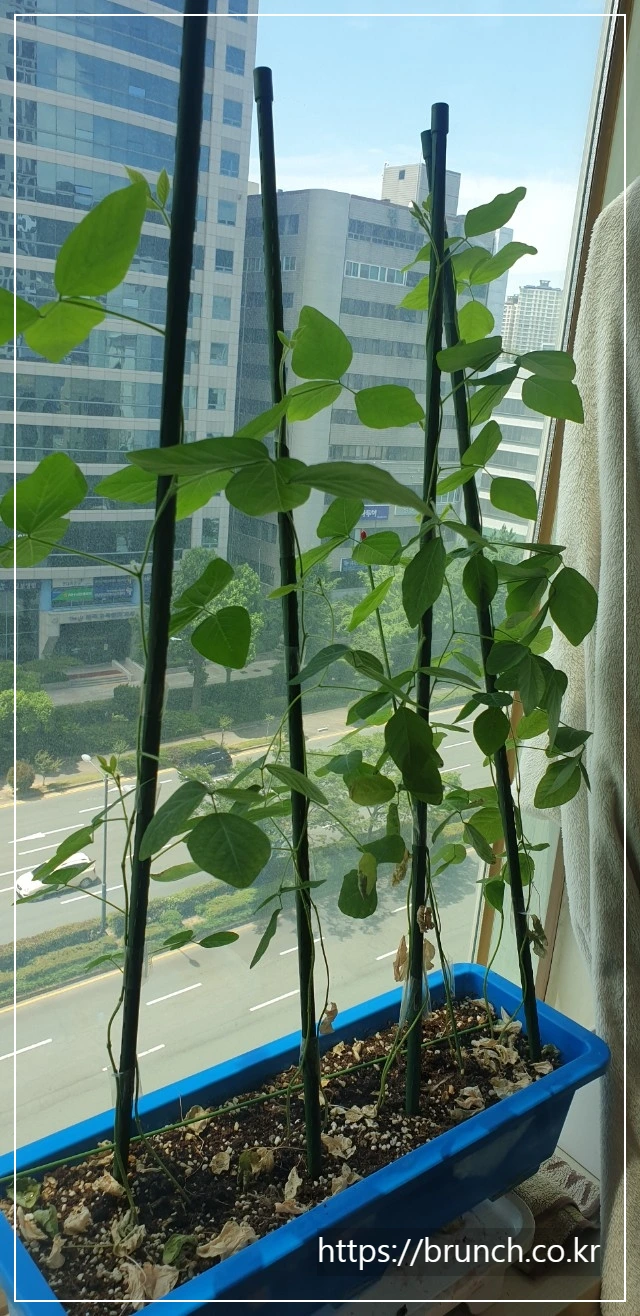 어제 아침에는 콩이 태양이 있는 쪽으로 너무 기울어져 자라고 있는 것 같아 화분 방향을 바꿔주었다. 창밖으로 목을 쭈욱 빼고 있던 콩잎들이 다들 방안으로 몸을 틀어 있는 것을 보니 나를 봐달라고 위치를 옮긴 것 같아 괜히 머쓱했다. 조금 혼란스럽겠지만 똑똑한 콩이니 곧 몸을 틀어 빛을 찾아낼 거라 믿었다. 이틀이 지난 저녁이다. 콩은 원래 자세가 기울어진 적이 없었다는 듯 빛을 향해 꼿꼿하게 등을 펴고 잎을 뻗고 있다. 참 신기한 생명체다. 며칠 뒤 자세가 또 너무 기울면 나는 화분 방향을 바꿔줄 것이다. 이것만은 오지랖이 아니라 너무 가늘어 목을 가눌 수 없는 웃자란 친구를 도와주는 것으로 여겨주면 좋겠다.