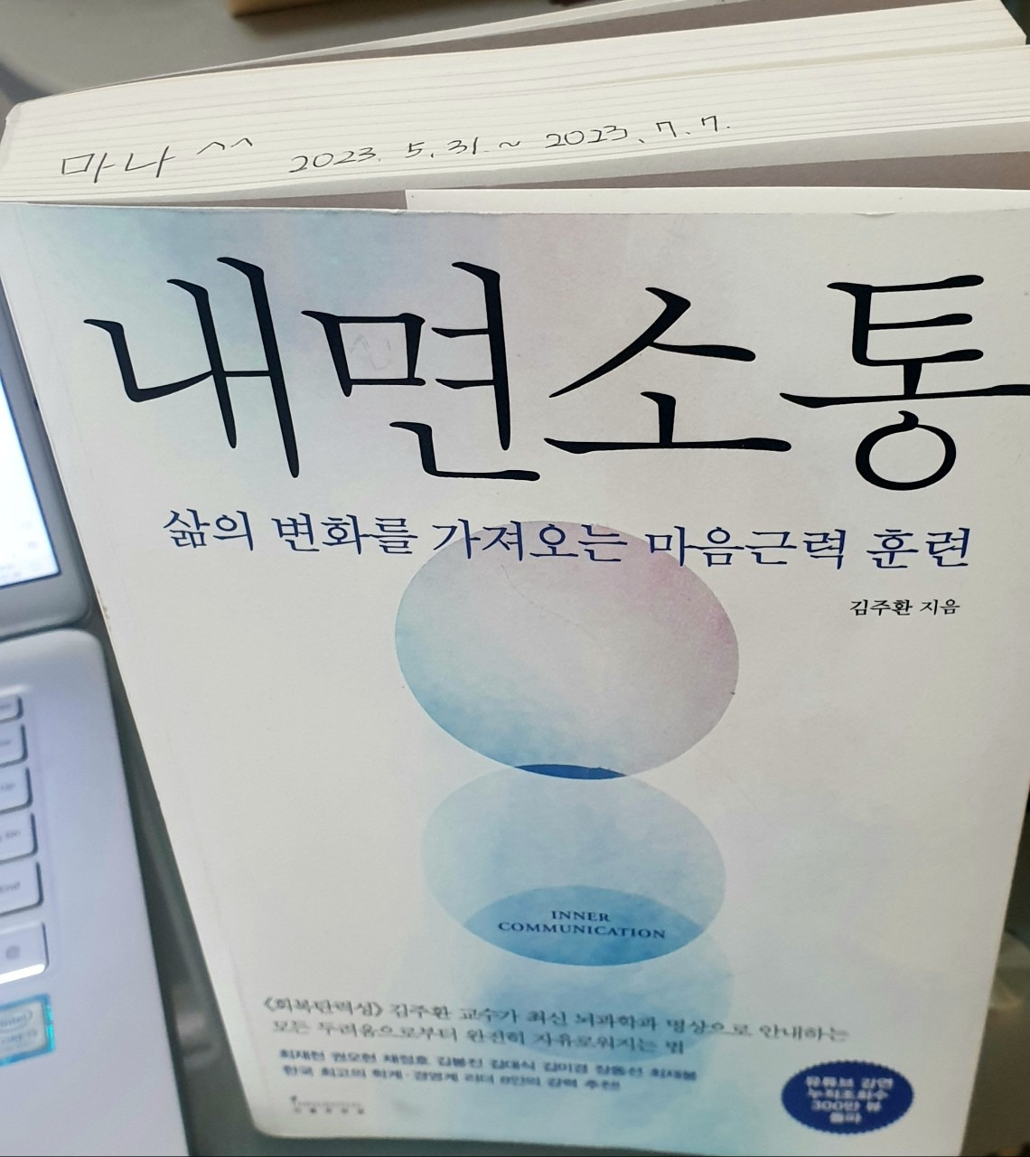 조용한 집에 벽돌책 하나를 던져 넣었다. 김주환 교수가 지은 <내면소통>이란 책이었다. 책을 추천받으며 읽기도 습관이라 주기적으로 그것을 깨는 독서를 해야 한다는 말을 들었다. 틀에 갇혀 살고 싶지 않다는 내 욕구를 건드리는 말이었다. 서점에서 본 책의 첫인상은 말 그대로 흰 벽돌이었다. 이성적으로 생각하기 시작하면 책 앞에서 한참을 고민하다 말 것 같아서 생각이 시작되기 전에 얼른 책을 샀다. 집에 돌아와 책상에 그것을 두고 뚫어지게 쳐다봤다. 안에 무슨 내용이 있는지 알지도 못한 채 책 표지에 적힌 '뇌과학과 명상'이라는 말만 보였다. 저 벽돌과 내가 친해질 수 있을까. 의심만 들뿐 답은 없어 다시 생각고리를 끊었다. 그리고 요즘 한창 책 파는 것에 맛 들인 내가 도중에 포기하고 되팔까 봐 윗부분에 크게 내 별칭과 산 날짜를 적었다. 그렇게 빼도 박도 못하게 흰 벽돌은 내 차지가 되었다.