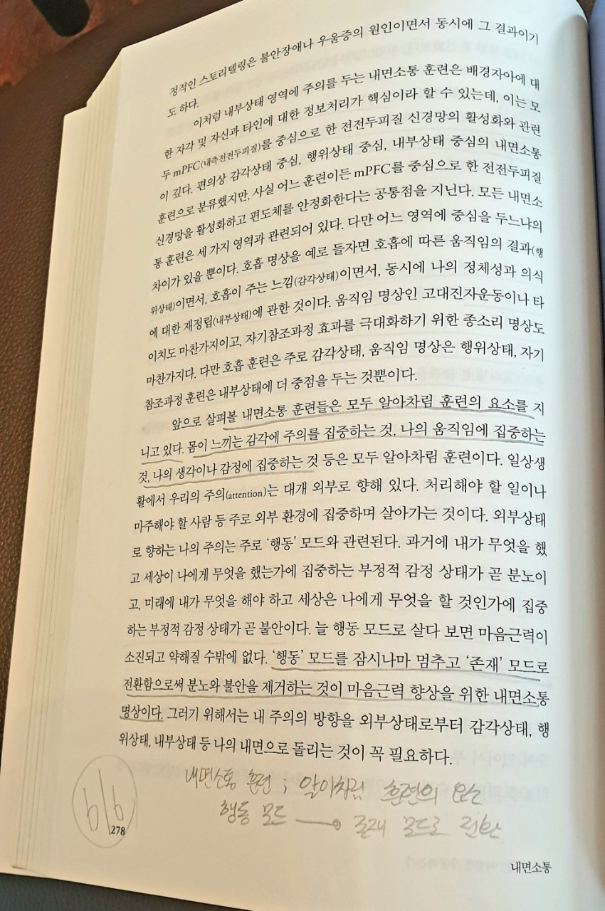 스마트폰 데이터를 끊은 지 얼마 되지 않았을 때였다. 집안의 고요함이 부담스러워 몸 둘 바를 몰라하던 나는 '삶의 변화를 가져오는 마음근력 훈련'이란 부제를 보며 변화라는 단어에 밑줄을 그었다. 그리고 벽돌 앞에서 완독만을 목표로 움직이기 시작했다. 내용에 대한 욕심은 부리지 않기로 했다. 독서의 틀을 깨기 위해 두꺼운 책에 대한 두려움을 내려놓고 싶었다. 일단 책을 폈다. 그리고 읽고 싶은 만큼만 읽어나갔다. 편도체, 전전두피질과 같은 뇌에 관련된 전문 용어를 처음 접했을 때에도 이해가 되는 만큼만 받아들였다. 모르는 것은 그냥 넘어갔다. 이제와 생각해 보면 이것이 내가 이 책에 대한 부담을 줄여나갈 수 있었던 길이 아니었을까 싶다.