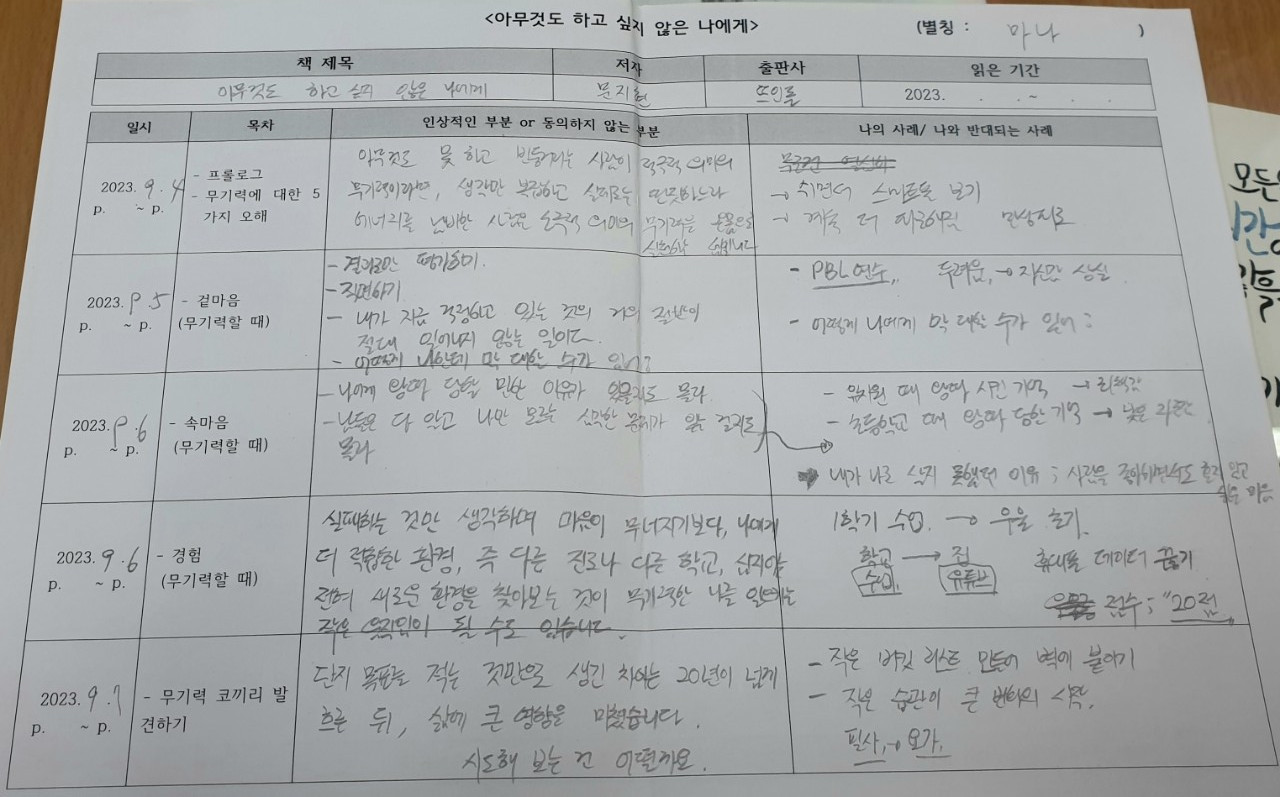 교사는 수업을 통해 학생에게 대화신청을 한다. 2학기 심리학 시간을 시작하며 학생들에게 책 <아무것도 하고 싶지 않은 나에게>를 소개했다. 함께 책을 읽고 이야기를 나누며 '상관없어'와 '아무거나'에 대한 각자의 의미를 찾아보자고 했다. 무기력이란 단어는 부정적인 의미를 포함해서 쓰이는 경우가 많다. 그래서 처음 말을 꺼내기가 조심스러웠는데 의외로 학생들은 무기력을 있는 그대로 받아들였다. 책은 스스로를 직면하는 것에서부터 무기력을 알아가게 했다. 우리는 책을 읽고 각자와 닮은 부분을 찾아 자신의 이야기를 했다. 얼마나 객관적으로 내가 나를 볼 수 있는지가 관건이었다.