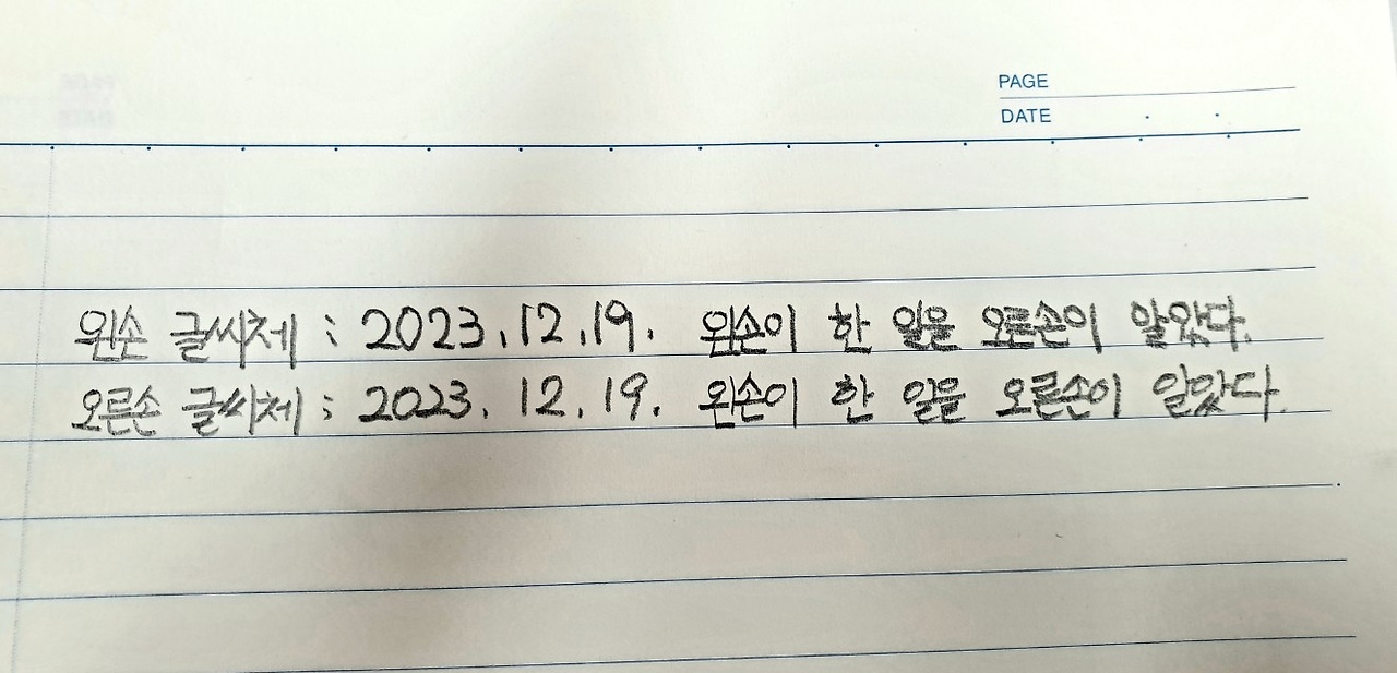 무슨 일이 있을지 잘 알지 못한 채 시작한 필사였다. 그저 사람들이 하는 말을 몇 개 주워들은 후 호기심으로 움직이던 왼손은 더듬거리며 시간을 따라 말 그대로 꾸역꾸역 걸었다. 그리고 며칠 전, 나의 우려와는 달리 왼손이 오른손에 영향을 주었다는 사실을 알게 됐다. 조금 전 내가 쓴 일기임에도 불구하고 변한 글씨가 내 것이 맞는지 다시 봐야 할 만큼 믿기지 않았다. 고등학교를 졸업하고 글씨체에 신경 쓸 필요가 없게 되었을 때부터 흘려 쓴 글씨였으니 꽤 오랫동안 흐르던 것이 왼손을 따라 다시 몸에 힘을 주기 시작한 것이다.