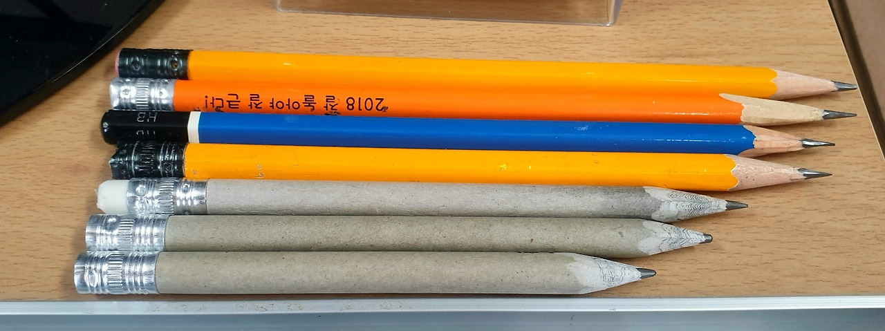 오늘은 제일 작은 연필을 들었다. 신문지로 만든 연필은 깎을 때마다 인쇄된 글씨의 흔적이 보였다. 신문 용지 자체가 회색이긴 하지만 내 손때가 더해져 연필은 더 진한 회색이 되어 있었다. 오전 수업을 하며 연필을 쓰고 교실 책상에 그대로 두고 나왔다. 나도 모르고 있다가 한참 뒤에 연필을 찾아 교실에 다시 들어갔는데 연필은 나 외에는 다른 누구의 관심도 받지 못한 채 바닥에 떨어져 있었다. 괜히 미안해 연필을 주워 먼지 묻은 곳이 없는지 살폈다. 뒤에 붙어 있는 지우개도 거의 다 썼고 길이도 잡기 힘들 정도로 짧았지만, 나에게는 세상 어떤 것보다 긴 연필이었다.