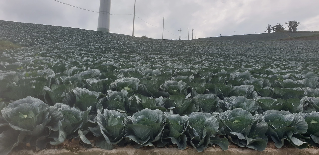 좁은 길을 지나니 갑자기 시야가 확 트였어. 바로 눈앞에 고랭지 배추밭이 펼쳐져 있었지. 매봉산 정상 근처에 배추밭이 있다는 걸 듣긴 했지만 그렇게까지 넓을 줄은 몰랐어. 사방이 거의 배추로 빽빽하게 채워져 있더라고. 나는 배추밭 규모에 놀라다가 밭에 가까워질수록 배추 크기에 한 번 더 놀랐어. 원래 배추가 저렇게 큰 건가. 하나같이 싱싱해 보이는 배추들이 질서 정연하게 산 정상에서 자라고 있었어. 매봉산이 배추머리 하고 내 앞에 짠 하고 나타난 듯했지. '올라오길 잘했지?'라고 물으면서 말이야. 시원한 매봉산 바람에 배추의 머릿결도 흔들렸어. 풍성한 게 유난히도 탐스럽다 싶었어.