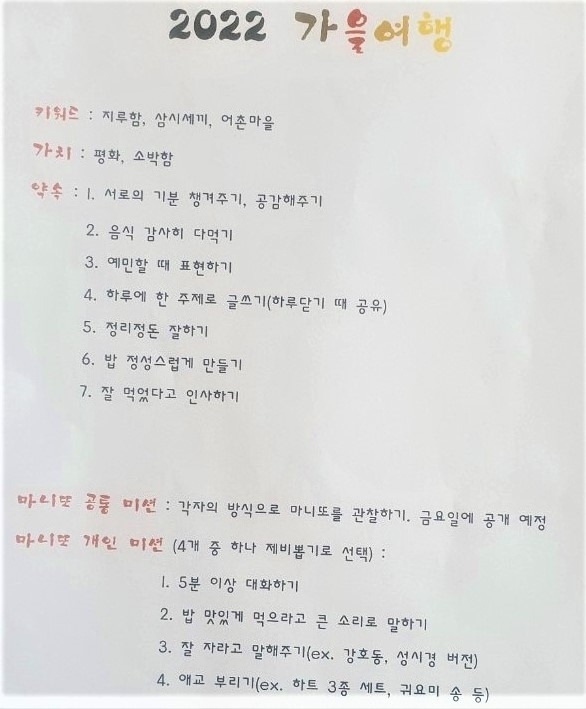 여행 내내 숨죽여 진행될 마니또 게임도 마지막 날까지 한몫할 것이다. 물 밑에서 일어나는 소리 없는 아우성들이 매일 진행되겠지. 그리고 마지막 날 그것들은 소리를 내며 다시 우리를 웃게 할 것이다. 밥 먹는 것 빼고는 아무것도 안 해도 되는 콘셉트의 여행이다. 사람들 사이에 잔잔한 대화가 오고 간다. 끼니와 끼니 사이에 조용한 시간이 흘러간다. 고요하고도 평화로운 시간이 스파게티를 먹고 난 후 먹는 귤 맛과 같다. 스파게티는 맛있었다면 귤은 진짜 맛있었다.