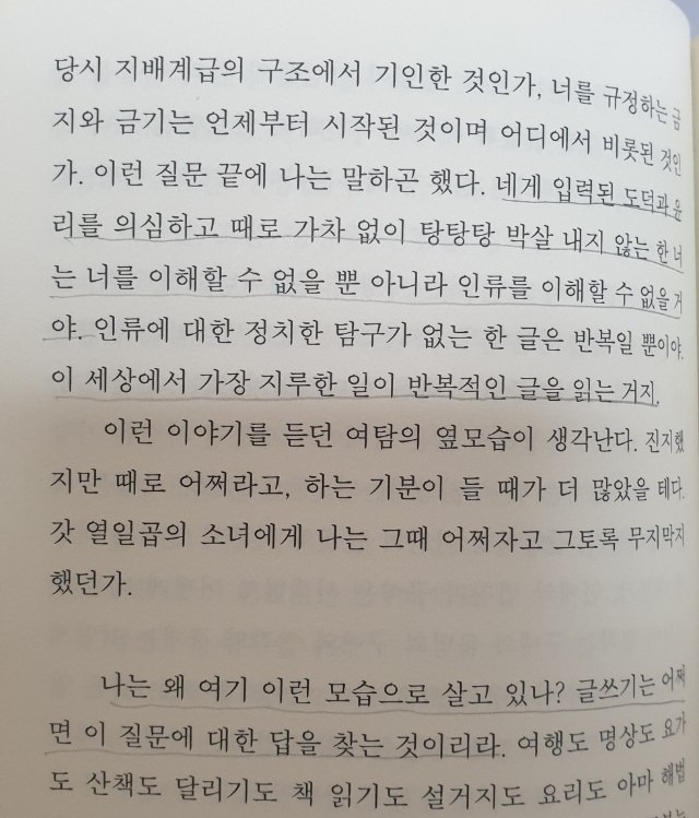 책은 재미있는 만큼 계속해서 나에게 자극을 줬다. 이 책을 읽으며 들었던 질문은 "나는 내 진짜 모습을 볼 수 있는가?"였다. 스스로에 대한 솔직함. 어딘 작가는 여러 가지 사례를 들어가며 있는 그대로의 모습을 볼 눈을 가지고 있는가를 물었다. 글 쓰는 자의 최소한의 자격이라 말하는 듯했다. 나는 아직 답하지 못했다.