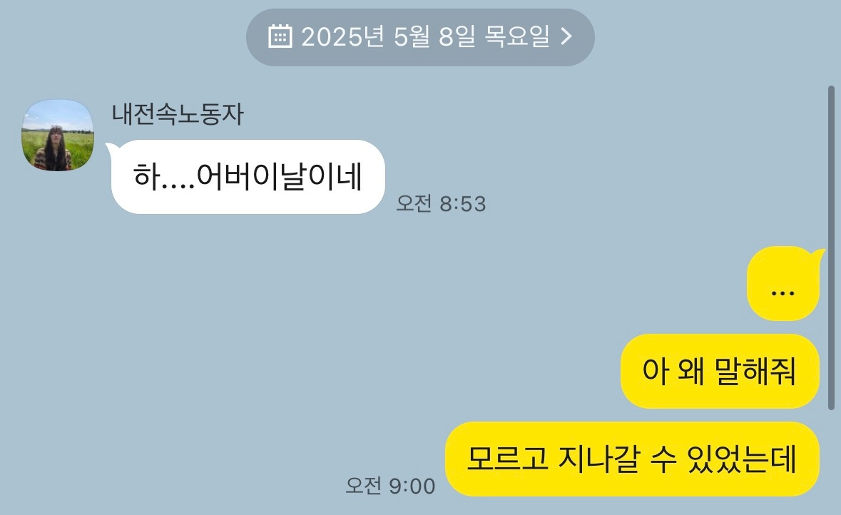 어린이날은 어? 초등학교 졸업하자 마자 이제는 어린이 아니라고 챙겨주지도 않았으면서 왜 어버이날은... 왜 어버이는 처음부터 끝까지 어버이냐고. 어버이는 졸업도 뭐 휴학도 없어요? 34살도 어린이날 챙겨주면 안 돼요? 저 키만 보면 어린이에요.