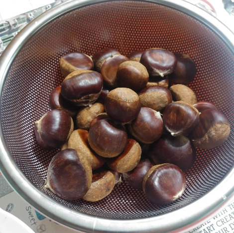 아파트와 도로 사이에 100미터쯤 이어진 숲길이 있다. 우리 집 댕댕이랑 자주 산책 다니는 코스다. 그곳에서 떨어져 있던 밤을 공짜로 주웠다고 난리를 핀다.