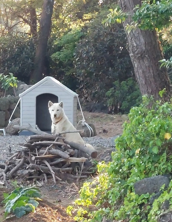 세 번째 친구는, 뭍에서 와서 전원주택 예쁘게 짓고 사는 집의 백구다. 전원주택은 그림처럼 예쁘고, 잔디도 푸르른데. 근데 '구박이'는 울타리 안에 살지 못한다. 울타리 밖, 소나무 아래 개집에서 산다. 대부분 나무 그늘에서 잠을 자거나, 지나가는 우리를 멀뚱멀뚱 쳐다본다. 아주 가끔 꿈에 떡 본 듯 개집이 비어있을 때가 있는데, 그때는 뭍에서 내려온 20대 딸이 구박이를 산책시키는 듯하다. 그래서 '구박이'다.
