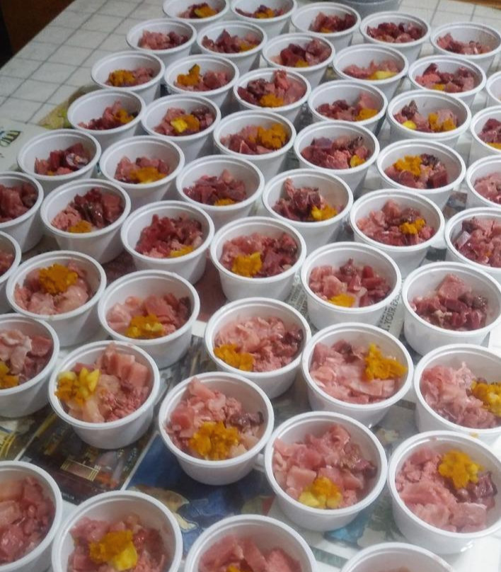 한 달에 한번 60회 분량의 생식을 한꺼번에 준비한다. 앞치마를 정갈하게 차려입고, 피나 내장이 튈 수 있는 주위의 주방기기들을 모두 종이로 덮고, 비닐장갑을 양손에 끼고 칼을 간다.