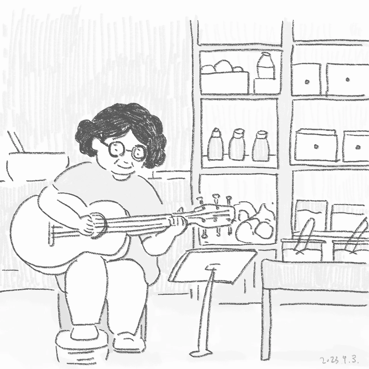 사장님에게는 취미가 있으시다. 바로 기타 연주이다. 손님이 없을 때마다 틈틈이 기타를 연습하신다. 가게 구석에 악보대와 기타가 세워져 있는데, 며칠 전 아이가 기타를 보더니 "기타가 바뀌셨네요?"라고 사장님께 물어보았다. 사장님은 깜짝 놀라시더니 "어떻게 알았어? 클래식 기타에서 통기타로 바꾸었어."라고 하시며 기타 동호회에 가입했고 가을에 발표회도 있다고 하셨다.