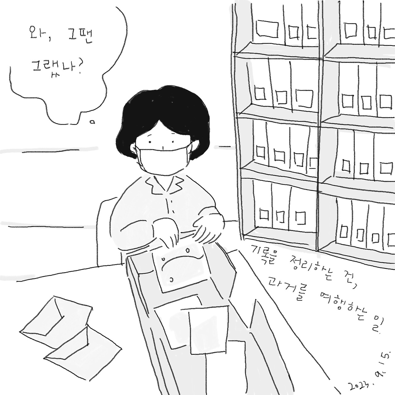 서고에서 지난 기록을 찾아 정리했다. 기록을 정리하다 보면 서고에 쌓여 있는 기록에 마음이 답답해지곤 한다. 하지만 하나하나 기록에 이름을 붙여주고 정리를 하며 기록이 만들어진 시간, 사람을 간접적으로 만나며 정리하는 일에 빠져든다. '10년 전에는 이런 폰트가, 이런 제목이 유행이었구나.' 'J선배가 기안한 문서네.' 기록을 가만히 보게 된다. 가끔 행사 사진 속 너무 젊은 누군가의