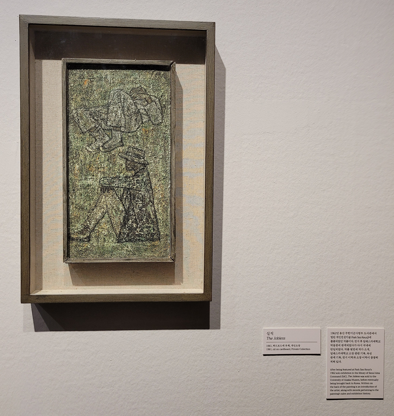 <실직>, 1961, 하드보드에 유채, 개인소장3부 '창신동 사람들'은 박수근이 10년 동안 살았던 창신동에서 그린 작품들이 전시되어 있다. 이 코너에서 <세 여인>, <아기 업은 소녀> 등 익숙한 작품들을 만날 수 있었다. 전시 벽면도 1950~1960년대 전후 어려웠던 시대의 색과 질감을 표현한 듯한 진회색 벽면이 그림과 잘 어울렸다.
