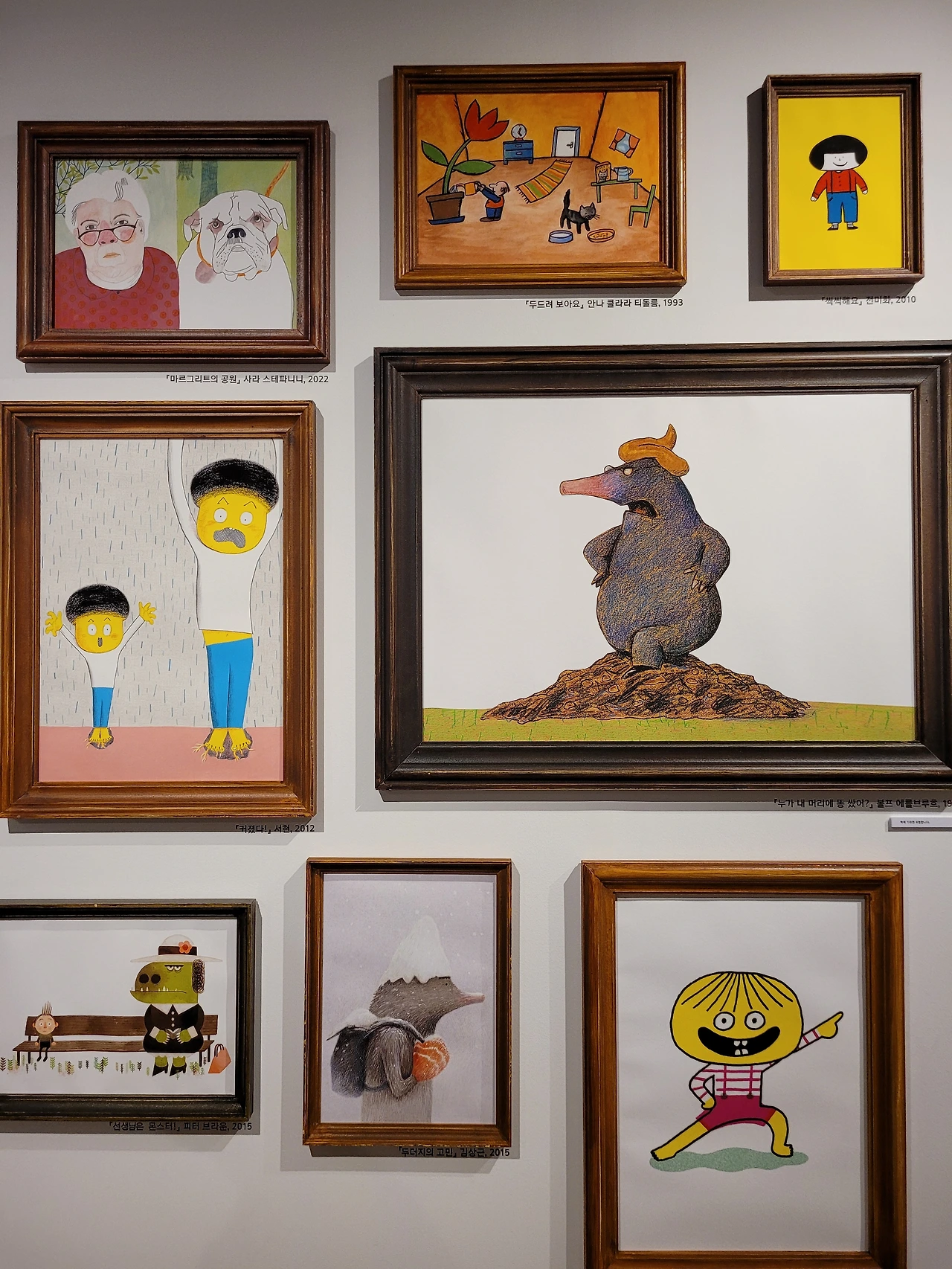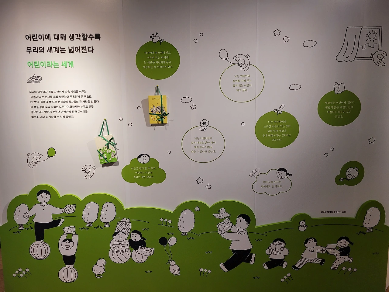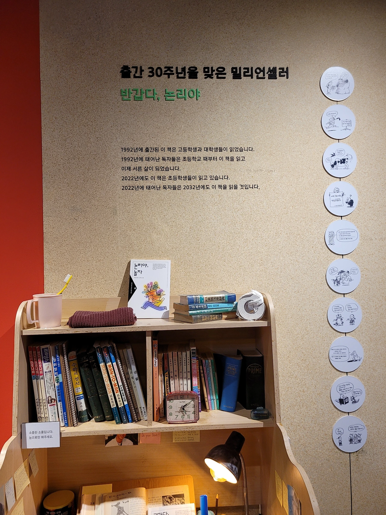 어린이날 지혜의 숲은 사람들로 활기가 넘쳤다. 전시가 있는 곳은 특히 사람이 더 많았다. 전시장 입구에 퀴즈 엽서를 만들어 놓아 전시를 보면서 문제에 답을 적고 엽서를 안내 데스크에 가져가면 선물도 주었다. 아이와 답을 찾아가며 전시를 관람하였다. 사계절출판사에 좋아하는 작가들 책이 많았다. 소복이 작가의 <소년의 마음>, 서현의 <호라이 호라이> , 이지은 작가의 <이파라파냐무냐무> 등 아이와 함께 읽은 만화와 그림책이 가장 먼저 눈에 들어왔다. 전시장 안쪽에 90년대 학생 책상 위에 놓인 <반갑다 논리야>가 반갑게 놓여 있었다. 초등학생 때 재미있게 읽었었는데 아직도 읽히는 책이란다.