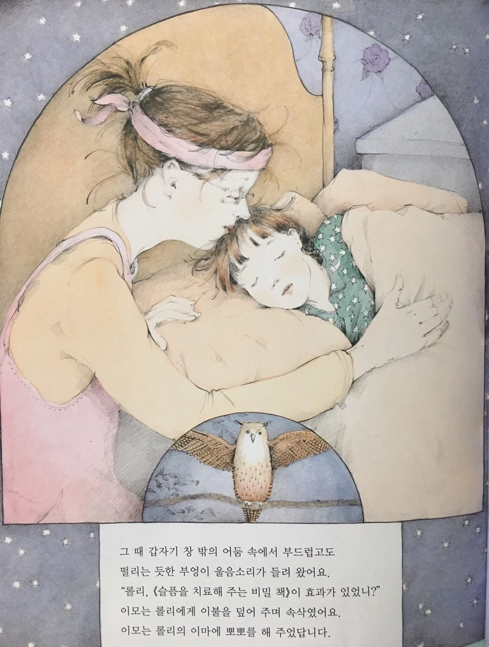 이모는 슬퍼하는 롤리의 눈물을 닦아주며 “가서 <슬픔을 치료해주는 비밀 책>을 가져와야겠구나”라고 말합니다. <슬픔을 치료해주는 비밀 책>은 비밀스러운 곳에 숨겨져 있습니다. 열쇠를 찾아, 다락방에 올라가, 비밀 책이 들어있는 상자의 열쇠를 여는 과정에서 슬픔은 이미 조금씩 자리를 떠나고 있는지도 모릅니다.