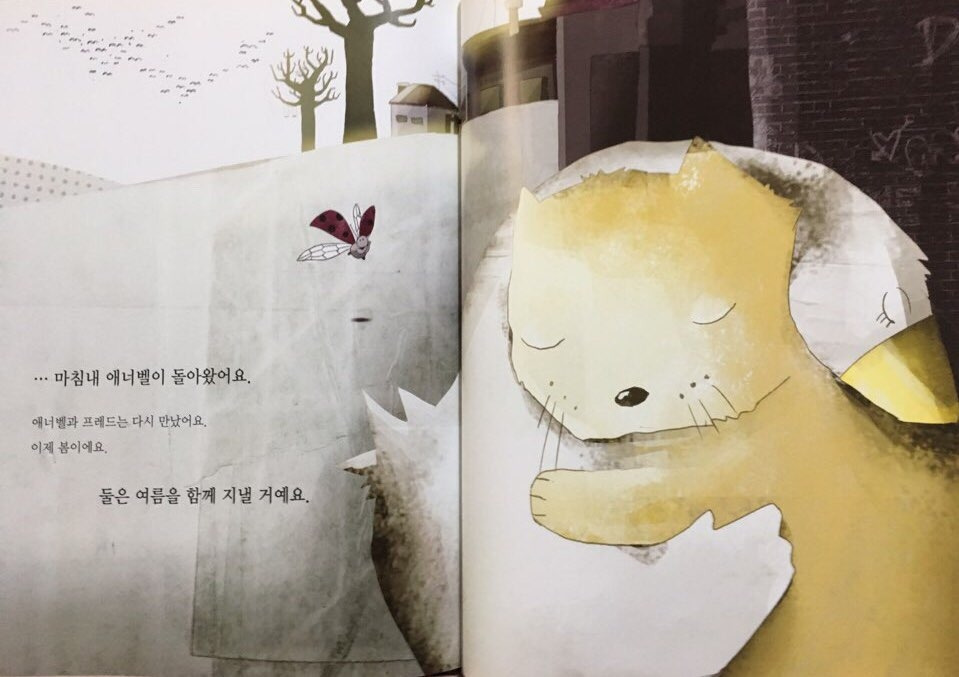 ‘들고양이 프레드와 회색 거위 애너벨은 둘도 없는 친한 친구입니다. 둘은 여름을 함께 지냈어요.’ 이렇게 시작하는 그림책은 첫 페이지에서 프레드는 에너벨에게 나무타는 법을 가르치고, 애너벨은 프레드에게 하늘을 나는 법을 가르쳐주지만 거위가 나무에 오르기도 쉽지 않고, 고양이가 하늘을 날기는 불가능함을 보여주며 존재의 간극을 드러낸다. 여름이 지나고 날씨가 추워지며 애너벨은 가족을 따라 머나먼 남쪽으로 날아간다. 긴 겨울동안 떨어져 지낼 수밖에 없는 두 존재가 사랑하는 법을 보여주는 그림책이다.