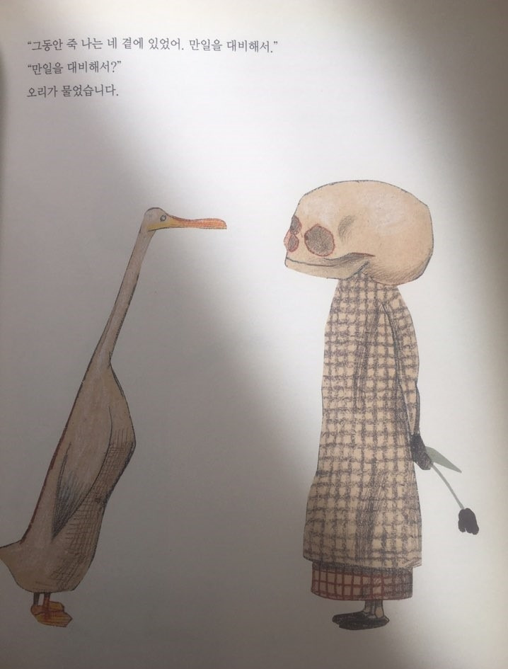 오리는 목과 부리가 길고, 곧게 서 있습니다. 죽음은 해골 모양의 머리에 체크무늬 원피스 같은 것을 입고 있는데 괴기스럽지만 귀엽습니다. 여백이 많은 그림이지만 서둘러 책장을 넘기게 되지 않고 오래 바라보게 됩니다. 죽음과 오리가 손을 맞잡거나, 죽어가는 오리를 바라보며 옆에 앉은 죽음 그림은 더 오래 시선을 머물게 합니다.
