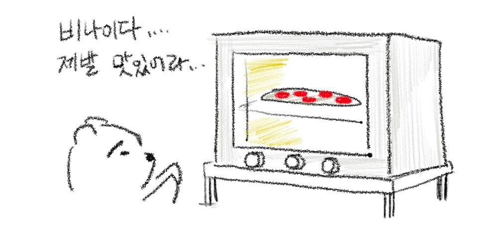 오븐에 구워지는 피자를 보고 있으면 맛있는 피자가 되기를 바라며 새 생명을 대하는 듯 경건한 마음까지 드는 것 같았습니다.
