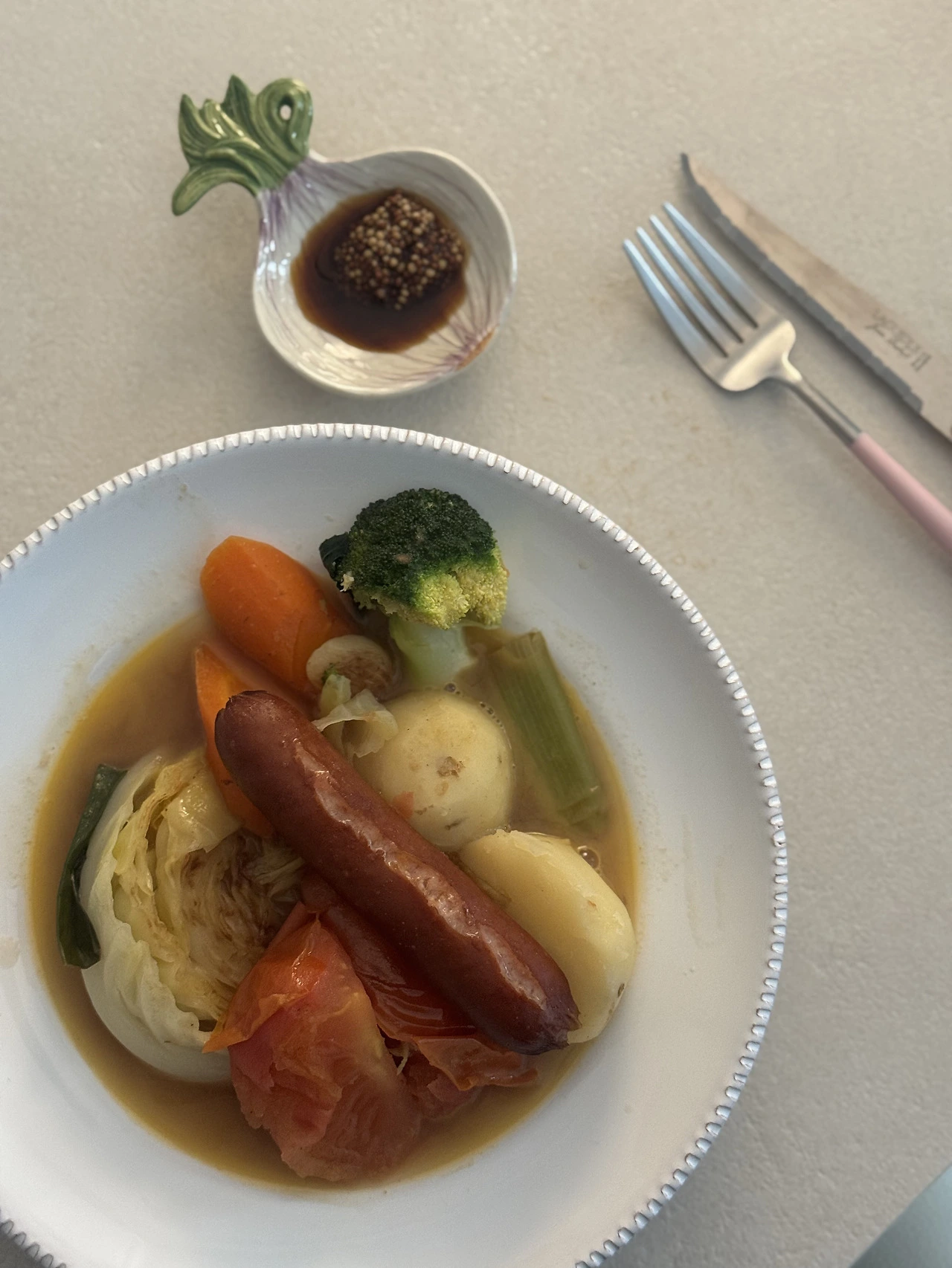 양배추, 감자, 당근, 토마토, 마늘, 셀러리, 브로콜리, 파 등등 집에 있는 모든 야채들을 버터에 굽다가 물과 코인 그리고 소시지를 넣어 끓이면 끝나는 간단한 레시피. 그 간편함에 비해 칼로 야채를 슥슥 썰어먹는 즐거움, 온갖 채수가 어우러진 깊고 진한 국물 맛, 야채 하나하나의 맛을 즐기는 재미가 쏠쏠하다고 하기에 미안할 정도로 가득했다. 특히나 평생을 익은 당근과 척지고 살아온 인생에서 익은 당근이 이렇게 맛있을 수 있다는 것이 큰 충격이었다.