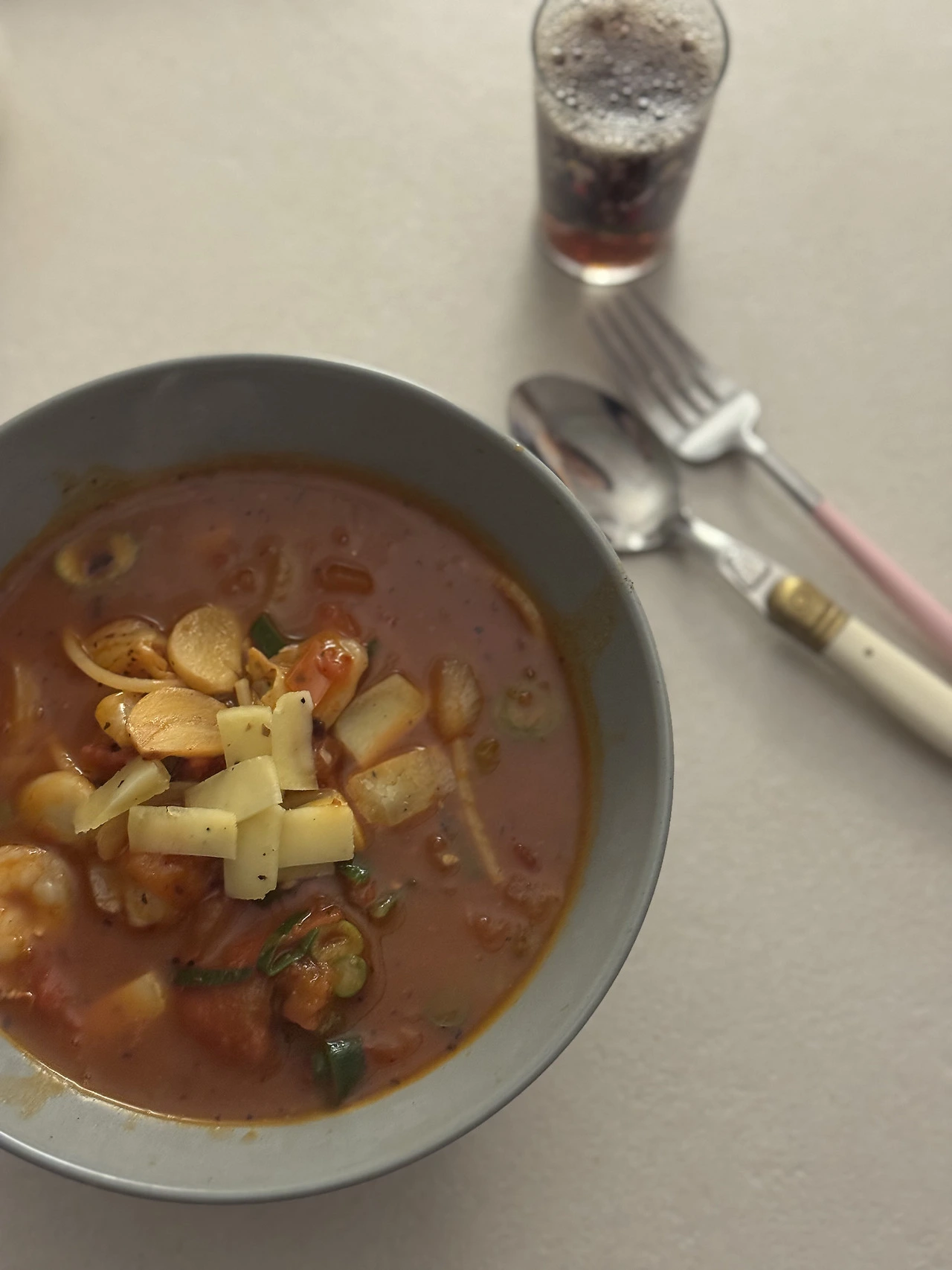 마늘, 양파, 고춧가루를 볶는다. 맛있는 기름이 완성되면 거기에 토마토소스와 고추장, 토마토를 넣어 끓인다. 옆에 냄비에 파스타면을 끓이다 면이 조금 설익었을 때 면과 면수 일부를 수프에 넣는다. 면이 수프를 호로록 흡수하면서 익도록 보글보글 끓이다가 맛술에 재워둔 새우, 대파, 청양고추를 넣고 후루룩 끓여낸다. 마지막으로 치즈를 스윽 올린다. 요리는 금방이지만 국물이, 끝내준다.