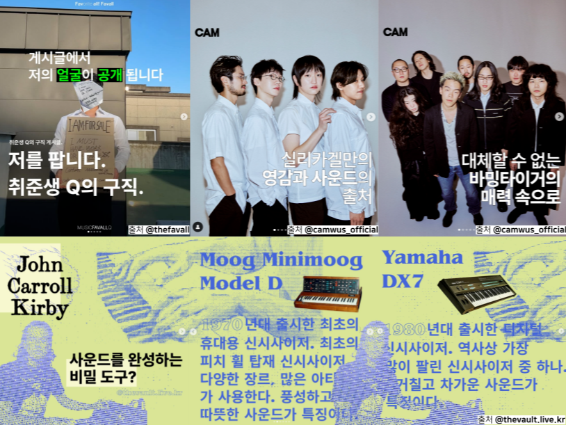 위와 같은 장점 덕분인지 최근 인디 레이블의 채용 공고에는 씬에 대한 지속적인 관심과 기획력 그리고 콘텐츠 제작 능력까지 보장된 SNS ‘매거진’ 계정 운영 경험자를 우대하는 항목도 심심치 않게 볼 수 있다. 실제로 ‘FAVALL(페이볼) (@thefavall)’의 운영자이자 에디터 Q는 페이볼에 공개 구직 콘텐츠를 발행하며 자신을 어필해 현 CAMWUS의 정준구 대표를 비롯한 여러 업계 관계자들로부터 러브콜을 받았고, 현재 MPMG 산하의 더 볼트에 입사해 더 볼트의 공연 소식을 전하는 @thevault.live.kr에서도 감각적인 자체 홍보 콘텐츠를 선보이고 있다. 또한 앞서 언급한 CAMWUS의 경우 레이블에서 인스타 매거진 콘텐츠의 형식을 차용해 자사 아티스트 IP의 높은 이해도를 바탕으로 한 콘텐츠를 공식적으로 제작해 발행하기 시작했다.