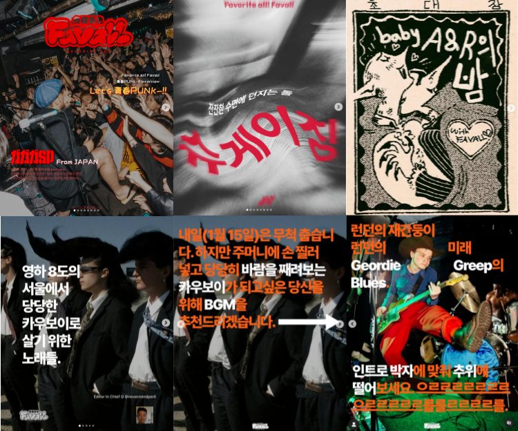 이를 대표하는 계정을 몇 가지 소개하자면, 우선 종합 음악 매거진 채널 'FAVALL(페이볼) (@thefavall)'(이하 페이볼)이 있다.