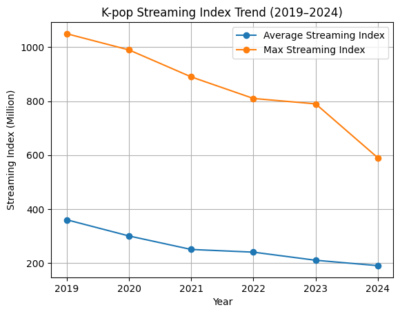 글로벌 음악 산업에서 스트리밍은 여전히 중요한 수익원이다. 그러나 더 이상 폭발적으로 성장하는 영역은 아니다. 실제로 최근 몇 년 간의 데이터를 살펴보면 이러한 흐름은 분명하다. 주요 음원 플랫폼의 MAU(Monthly Active Users: 월간 활성 이용자 수)와 이용 시간은 정체 구간에 들어섰고, 같은 기간 동안 스트리밍 지표 전반에서도 하락세가 관찰된다. 2019년 대비 2024년 기준, 최고 스트리밍 지수와 평균 스트리밍 지수 모두 약 40~50% 감소했다. 이는 음악의 경쟁력이 떨어졌다는 의미라기보다는 스트리밍 시장이 포화 단계에 접어들며 수익이 분산되는 구조로 이동했음을 시사한다. 이러한 흐름을 종합해 보면 스트리밍 중심의 음악 소비가 이전만큼 활발하지 않음을 알 수 있으며 산업 전반이 성숙기에 접어들었다고 볼 수 있다. 같은 화제성과 노출을 확보하더라도 과거만큼의 스트리밍 수익을 보장하지 않는 시대가 된 것이다.