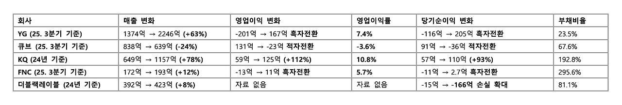 KQ와 FNC는 상대적으로 부채 의존도가 높은 편이다. FNC는 최근 흑자로 전환했지만 재무 구조는 완전히 안정됐다고 보기 어려운 회복 단계에 있다. 반면 KQ의 경우 외부 자본을 적극 활용해 사업 규모를 빠르게 확장하는 전략을 취하고 있다. 높은 부채비율을 감수하는 대신 이를 기반으로 콘텐츠 제작과 아티스트 활동을 확대하면서, 빠른 성장세와 높은 영업이익을 동시에 만들어내고 있는 구조인 것이다.
