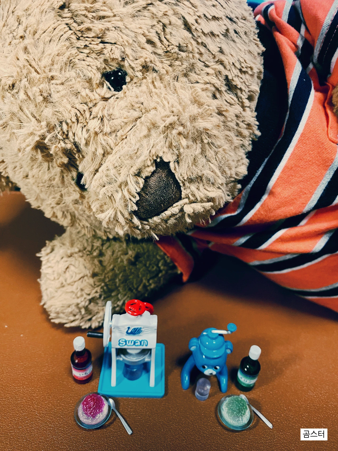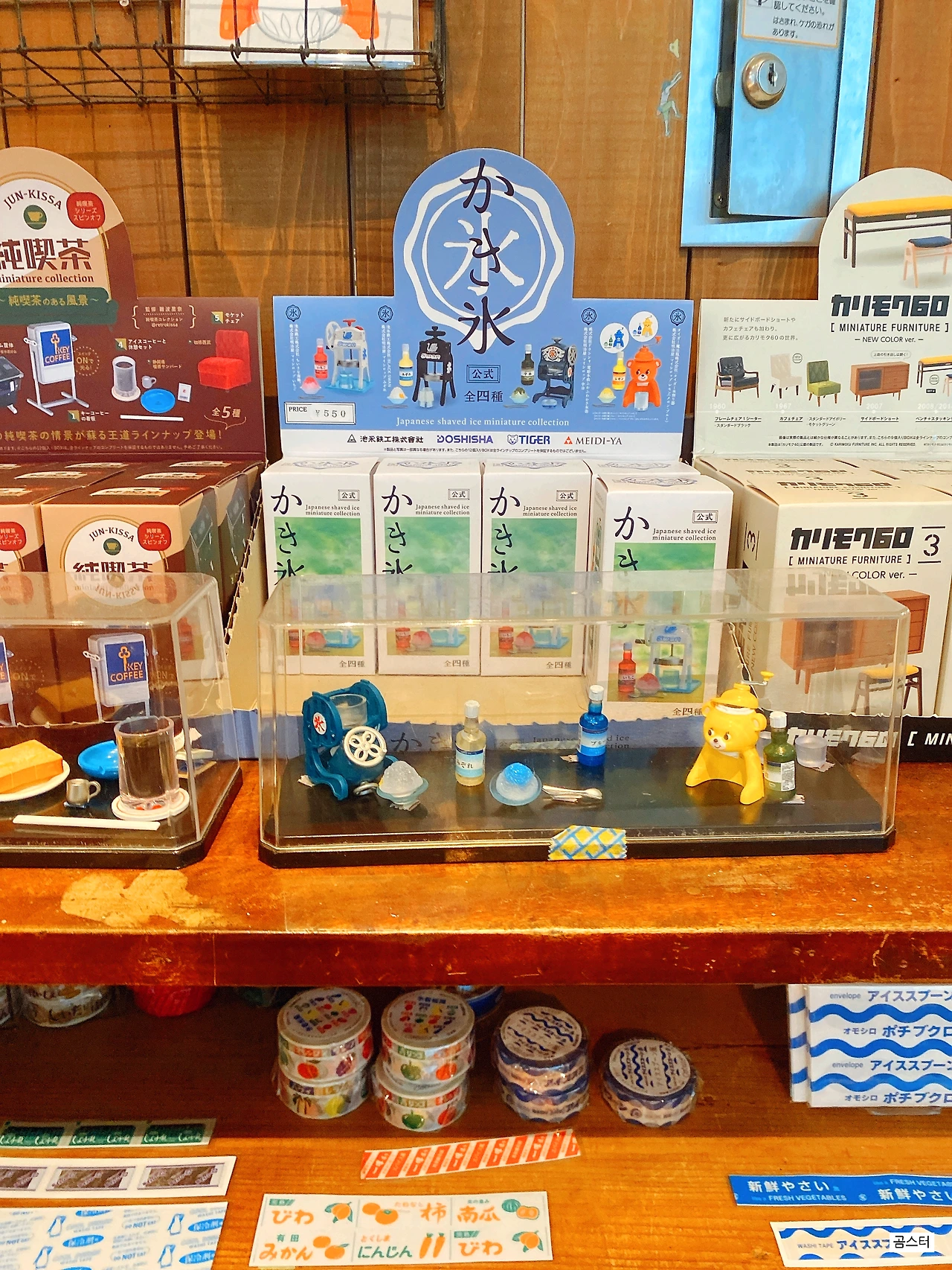 나무로 만든 엽서와 거치대: 일본 감성이 뚝뚝 묻어나는 기념품을 찾고 있었는데 눈에 딱 들어온 엽서와 거치대. (엽서:550엔, 거치대:200엔) 가차에서 득템 한 레트로풍 빙수기. 곰돌이 빙수기가 나올 때까지 2개 구매. (가챠:550엔*2)