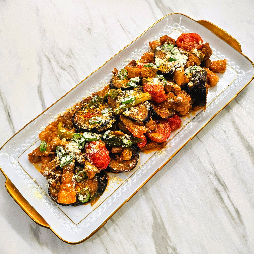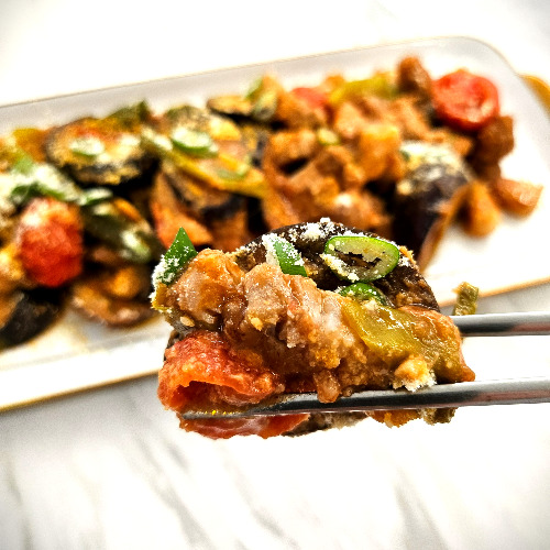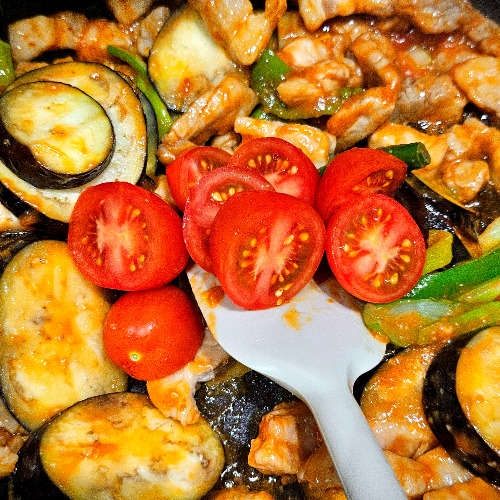 삼겹살, 가지, 토마토, 케첩, 된장, (쪽) 파, 파마산 치즈가루