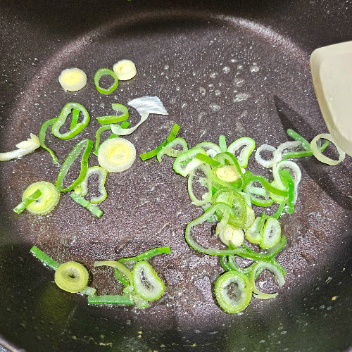 2. 기름 뺀 참치를 넣고 (물에 씻지는 않았다.) 마늘 한 숟가락을 넣어 중 약불에서 볶는다.