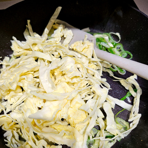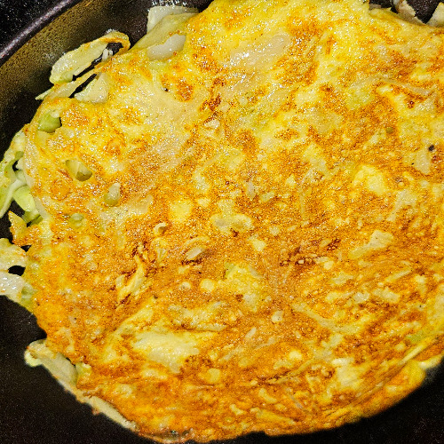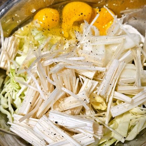 1. 채 썬 양배추에 양파 반 개, 팽이버섯 한 줌, 숙주 한 줌, 달걀 3개, 소금, 후추를 넣고 버무린다.