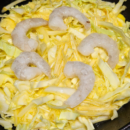 2. 프라이팬에 버무린 재료를 올리고 새우를 올린다.