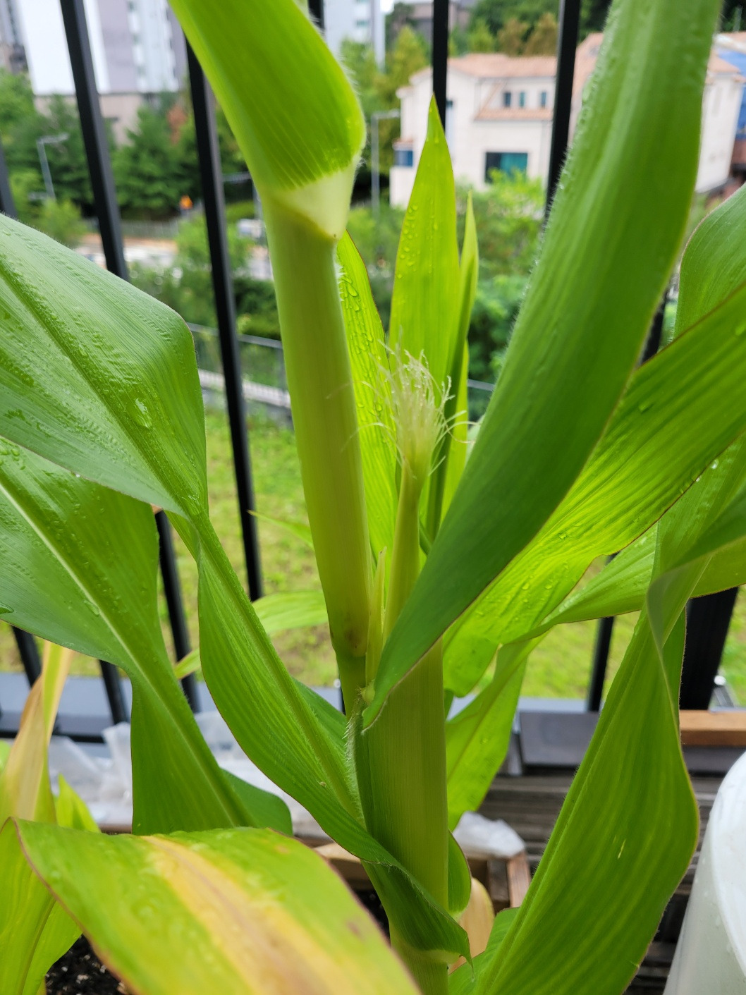 다른 식물들과 마찬가지로 옥수수도 기온이 풀리기 시작하자 무서운 기세로 쑥쑥 자라났다. 5월이 되면 식물들이 자라는데 가속도가 붙는다. 모든 것이 순탄할리 없다. 우산만큼 키가 자랐을 무렵 진딧물이 나타나기 시작했다. 한 두 마리 보이던게 순식간에 늘어나 옥수수 줄기가 초록색의 작은 진딧물로 가득 덮일 정도였다! 초보 정원사는 또 인터넷 여기저기를 뒤져 진딧물 퇴치에 좋다는 민간요법을 시도한다. 마요네즈 섞은 물을 이용해라, 분무기로 우유를 뿌려라, 무당벌레를 잡아와서 풀어라 등. 무당벌레 빼고는 다 해봤지만 그다지 효과는 없었다. 결국 진딧물, 깍지벌레, 응애라는 이름모를 적들을 한큐에 박멸한다는 농약을, 그 와중에도 친환경이라는 농약을 뿌려야만 했다. 역시 약은 약이라 며칠 사이 효과가 나타났다. 좀 더 버티지 못하고 농약을 쓴 건 옥수수 꽃이 지고 열매가 맺히고 있었기 때문이다. 옥수수가 충분히 자라면 흔히 개꼬리라고 부르는 수꽃이 삐죽하게 올라온다. 이 수꽃이 바람에 흔들리며 꽃가루가 이동해 수정되기 때문에 옥수수들끼리 가까이 심는 거다. 이 수꽃이 옥수수 마디에 톡 떨어지면 여기서 열매가 자라나기 시작한다.