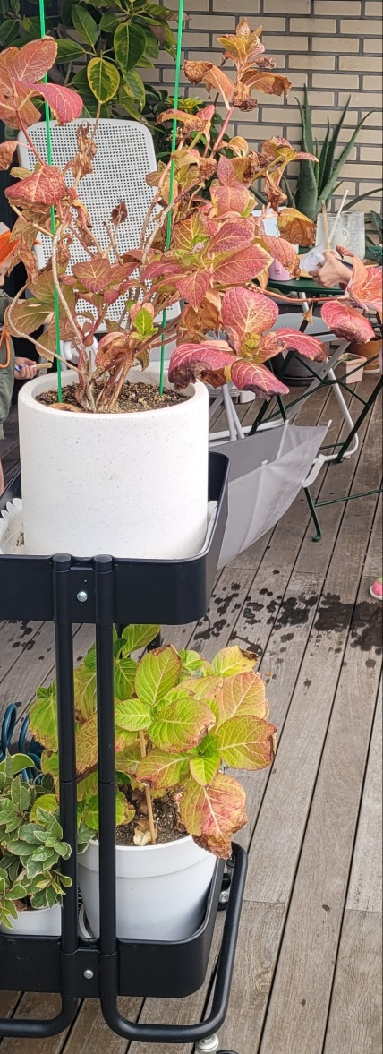 24년.1층 수국이, 2층 목수국이. 지는 모습도 예뻐요. 가을에는 수국도 붉게 물들며 잎을 떨굽니다.