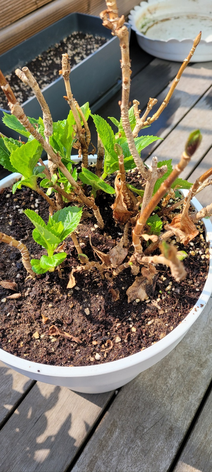 그러고 보니 결혼 하고 살았던 세 집에 늘 수국 화분이 있었다. 한 번도 같은 화분에서 두 번 꽃이 핀 적이 없었지만 삶이 바빠 그 또한 잠시 안타까울 뿐 금세 잊혀 지고 말았다. 지금 사는 집에 이사오고 나서야, 정원을 가꾸겠다고 마음먹고 나서야 좀 더 관심 갖고 찾아보며 대책마련에 나섰다. 원인은 가을철 화아 분화 시기에 많은 일조량이 필요하다는 것과 겨울철 적절한 저온처리였다. 6주 이상 도에서 지내야 하는데 일정한 온도가 유지되는 확장형 아파트 거실에서는 불가능한 것이었다. 그동안 수국이 꽃을 떨구고 다시 피지 않는 것을 ‘어쩔 수 없다.’고 안타까워하며 내가 할 수 있는 것이 없다고만 생각했는데 나의 정원 프로젝트가 용기를 내게 해주었다. ‘살리려면 뭐라도 해야한다.’ 그리고 여기서는 할 수 있었다. 꽃이 피어있을 때는 직사광선을 피해주고, 잎이 질 때 햇빛을 많이 쬐어줄 수 있는 곳으로 화분을 옮겨줄 수 있었고 '많은 일조량‘이 최고의 장점이며 매일 아침 호스로 물을 흠뻑 줄 수 있다. 테라스가 나에게 숨겨진 용기를 끌어내 주었다. 며칠 전에는 삽목했던 수국에서 작은 잎이 뾰족하게 올라오는 걸 발견했다. 번식도 성공했으면 좋겠다. 지금이 수국의 흥망성쇠 중 ’성‘이 시작되는 때라고 믿으며 더욱 용기내어 수국 정원을 일궈야지.