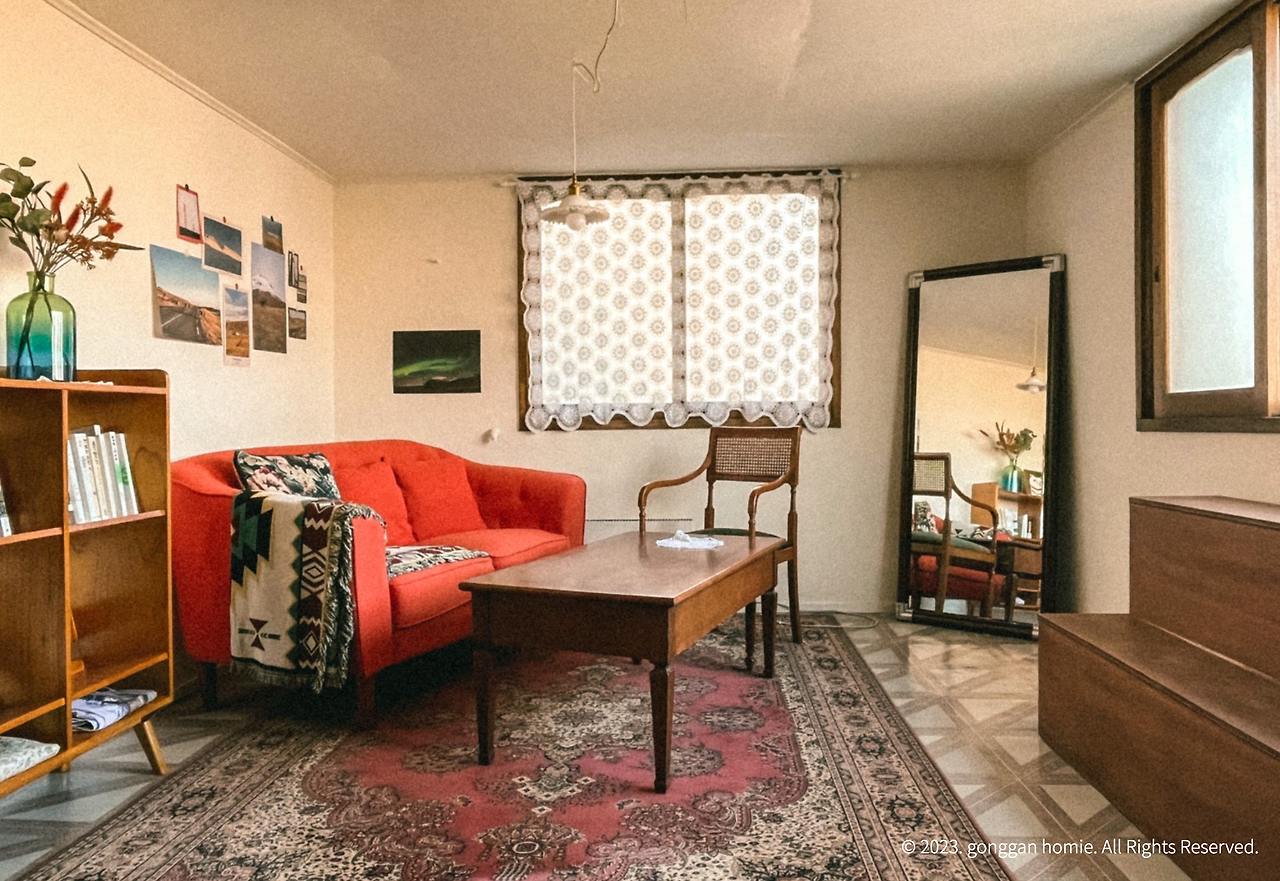친구들과 제로 웨이스트 트립을 다녀온 후 두 번째 공동체 상영을 기획했다. 최근 멤버로 입주한 작업실 공간호미에서 사람들을 초대해 영화를 보며 이야기를 나누는 지구미술의 날을 기획해보기로 했다. 공간호미는 빈티지, 레트로, 자연주의 인테리어를 추구하는 제로웨이스트 공간이다. 중고 가구로만 꾸며 가정집 같은 분위기를 풍기는 공간호미는 평소에는 호스트의 작업실이자, 비건 포트락 파티나 커피와 차를 즐기는 호미다방으로 쓰인다.
