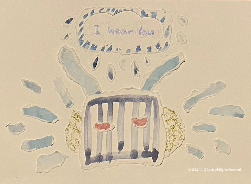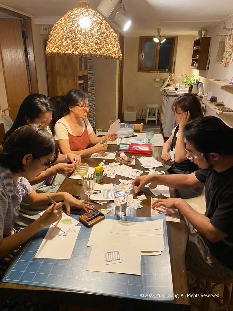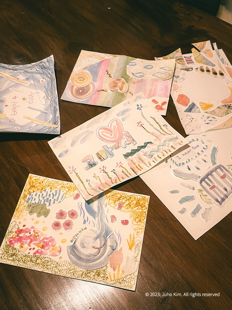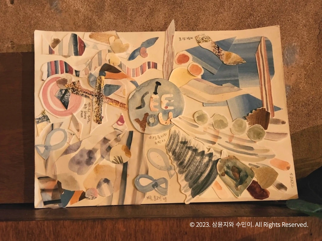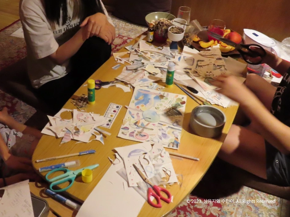 다큐멘터리 상영 후 우리는 그룹 콜라주 활동을 했다. 콜라주의 주제는 "지구에게 귀가 있다면, 뭐라고 이야기할까?"였다. 나는 그룹 콜라주 활동을 기획하면서 그동안 탐구해 왔던 지구색 물감을 준비해갔다. 흙, 풀, 돌, 꽃 등을 원료로 만든 천연물감으로 그린 추상적인 패턴을 오려 각자 지구의 아름다움을 묘사했다. 나무, 계곡, 물고기, 별, 계절의 오고 감을 조형적으로 시각화하고, 지구 위 생명들은 모두 하나의 DNA를 가졌다는 메시지를 표현하기도 했다. 그리고 우리는 지구에게 들려줄 말로 "I See You. 당신을 봅니다."를 적었다. 지구의 아름다움, 생명력 있는 모습, 신비로움, 우리와의 연결성을 매일 보면서 외면하지 않겠다는 다짐이었다.