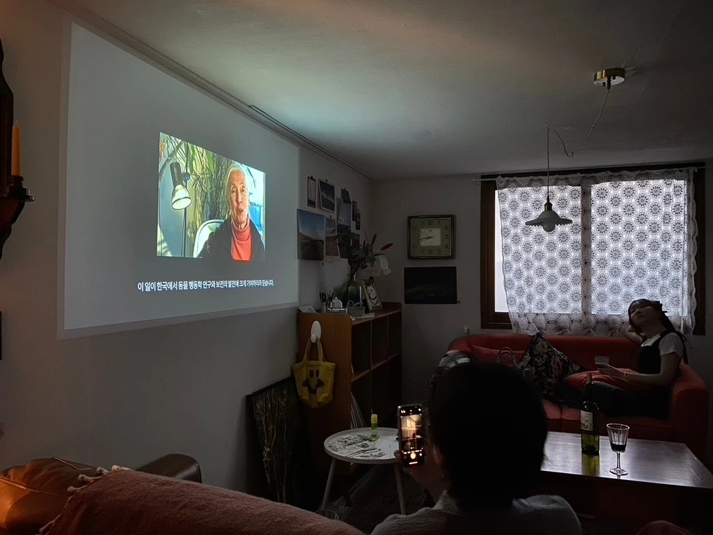 미술교육, 예술경영, 환경교육 분야에서 기후행동을 실천해 온 멤버들은 제인 구달 박사님에 대해 이미 조금씩은 알고 있었다. 하지만 다큐멘터리에 그려진 그의 영향력은 놀라울 만큼 구체적이고 세밀했다. 특히 다큐멘터리에서 유독 눈을 떼지 못했던 한 멤버는 그간 자신이 이어온 환경 교육 활동을 하며 느꼈던 바에 대해 다시 돌아보게 된다고 말했다. 나는 제인 구달 박사님의 메일함을 보며 좌절한 마음을 추슬렀던 한 활동가의 이야기가 인상깊었다. 우리는 지구와 동행하는 삶은 혼자 이루어갈 수 있는 게 아니며, 서로를 지지해 주는 만남과 대화가 지속가능성을 만드는 디딤돌이 된다는 걸 잊지 말자고 다짐하며 상영 소감을 나눴다.