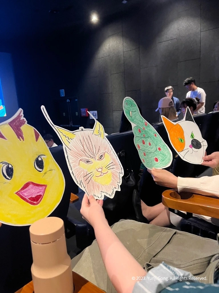 공동체 상영 후에는 앞서 소개한 지구색 물감을 활용해 "지구에게 귀가 있다면 무슨 이야기를 할까?"를 주제로 콜라주 활동을 했다. 지구에게 편지를 쓰는 마음으로 종이를 오렸다. 완성된 작품은 감탄을 자아냈다. 지구에게 고마움과 미안함을 표현하는 분도 계셨고, 아름다운 별들이 더 반짝일 수 있도록 하겠다는 다짐을 표현해 주신 분도 계셨다. 비와 무지개, 바람과 해 등 지구의 다채로움을 사랑한다는 고백도 담겨 있었다.