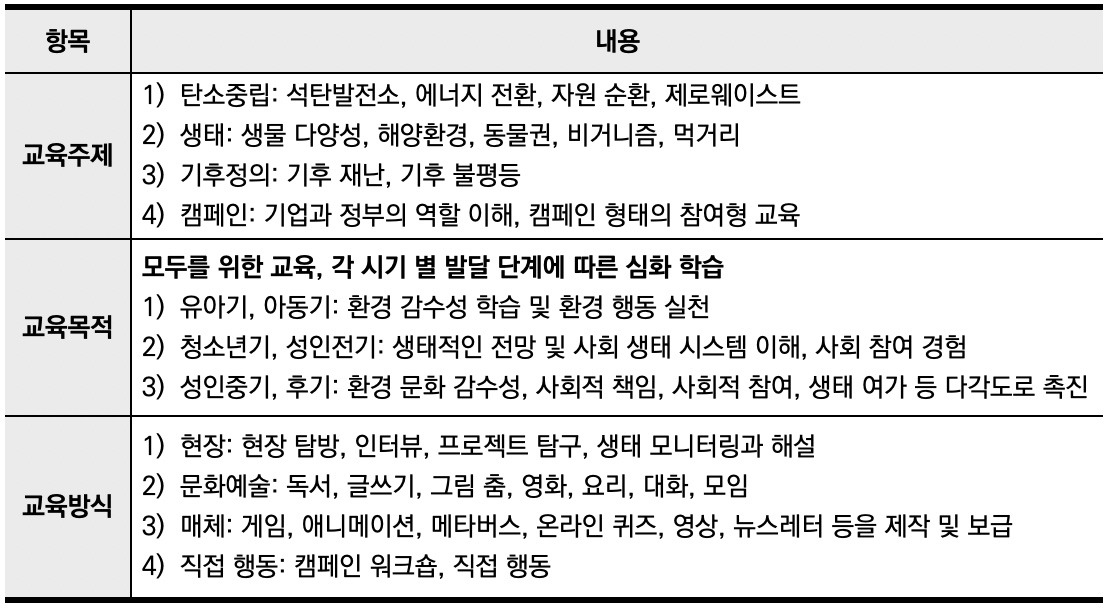 * 환경교육센터는 새 비전을 제시하기 위해 2022년 모두를 위한 기후예술학교를 열었다. 해당 학교는 영상, 연극 장르 예술가와 함께 예술을 매개로 실천할 수 있는 환경교육의 가능성을 타진하는 연구였다. 연결된 링크에서 예술 언어를 이해하기 위한 환경교육센터의 노력을 엿볼 수 있다(기사, 영상)