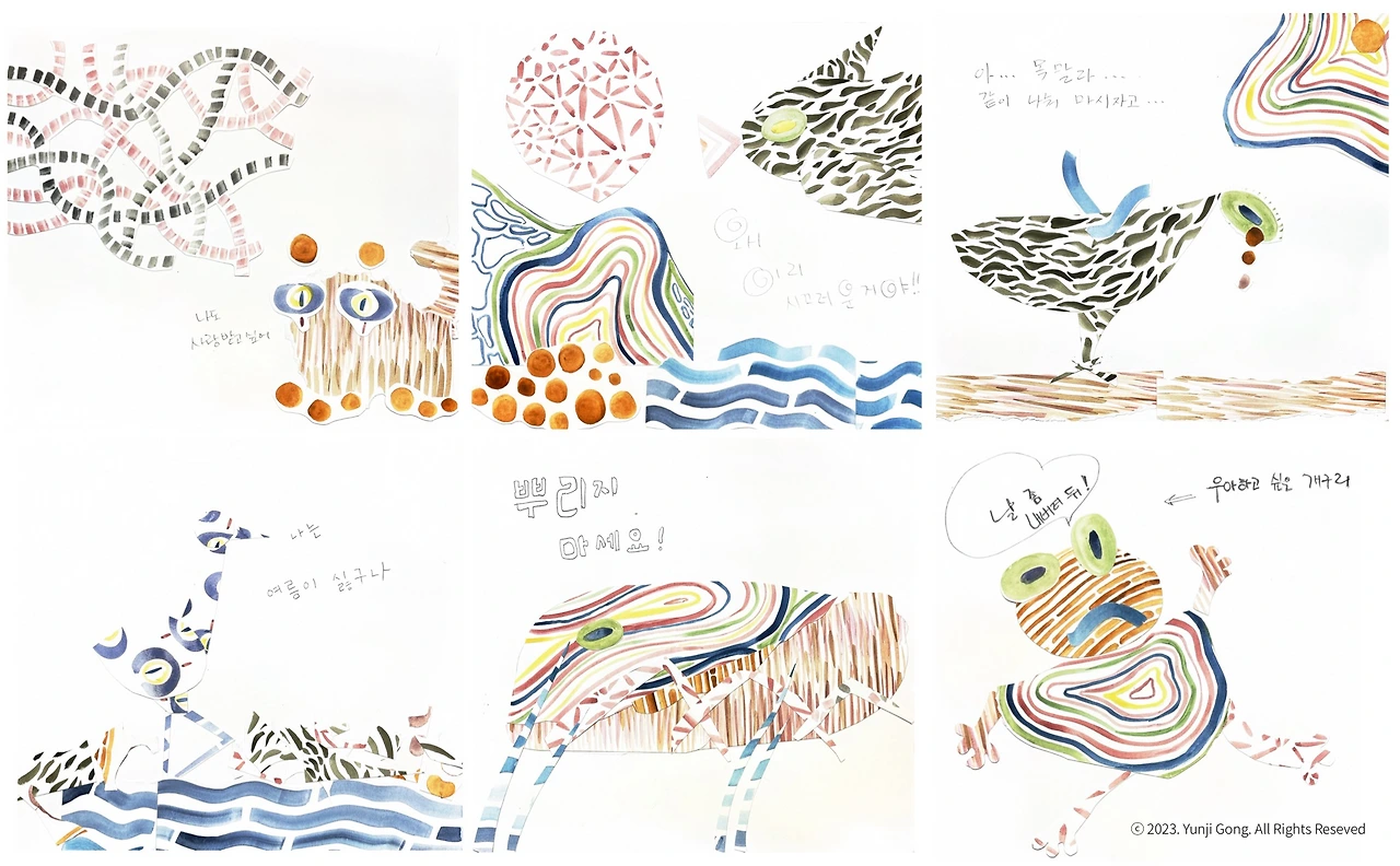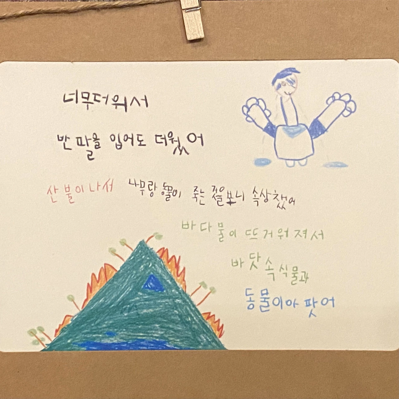 <공존사전> 워크숍을 통해 이 자리가 아니었음 기억에서 사라졌을지도 모를 수많은 우리 주변에 작은 존재들이 작품의 주인공이 되었습니다. 로드킬 당한 개구리, 불꽃 사이로 날아가던 까마귀, 논 사이에 숨어 있던 메뚜기, 오염된 강에 살던 청둥오리 등 수많은 동물들의 이야기가 터져 나왔어요. 그리고 <우정의 언어 예술> 북토크에서 예술 언어는 인간이 기존에 생태계와 맺고 있던 불균형한 방식을 탈피해 새로운 관계 맺기를 실현하게 해 준다는 것을 깨달았어요. 이러한 상상력을 경험하는 것이 구체적인 기후행동에 필수적인 여정이라는 것에 공감했습니다.