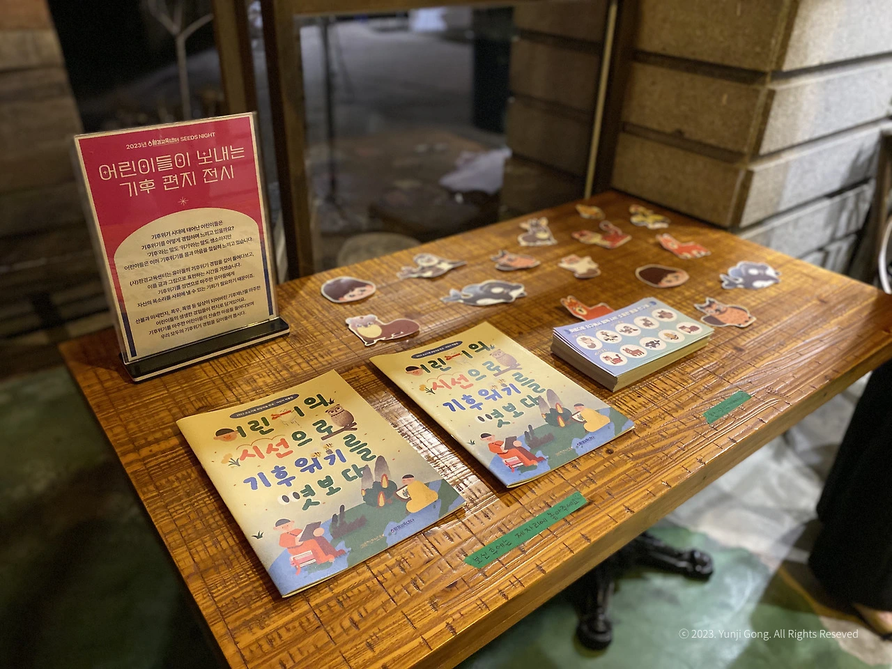 후원의 밤 행사장 한편에는 전시장이 마련되어 있었다. 지금까지 환경교육센터에서 문화 예술을 접목해 실행해 온 환경 교육 사례를 전시한 것이었다. 첫 번째 섹션에는 <어린이의 시선으로 기후위기를 엿보다> 프로젝트에 참여한 아이들의 그림이 전시되어 있었다. 눈물을 흘리는 어린이가 불탄 산에 대해 쓴 시화가 눈에 띄었다. 반팔을 입어도 더웠던 아이는 산속 동물과 나무, 바닷속 물살이와 식물의 안부를 물었다. 이어지는 <기후생태위기 X 청소년의 시선> 전시에는 기후생태위기의 당사자로서 청소년의 목소리가 담겨있었다. 앞으로 뜨거운 지구에서 우리보다 오랜 시간을 살아가야 할 청소년들들은 기후위기를 마주한 자신들의 몸과 마음에 대해 생각해보기도 하고, 세상을 바라보는 시선과 앞으로를 위한 선택을 기술했다.