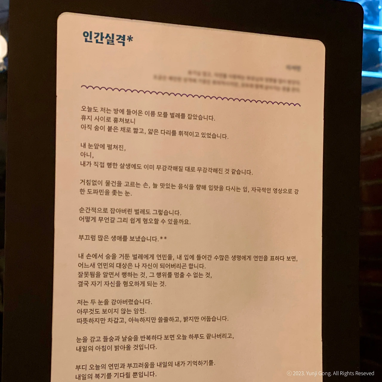 전시된 청소년의 글 중 다자이 오사무의 <인간실격>을 오마주한 한 학생은 무감각적으로 행하는 '살생'에 대한 성찰을 담았다. 시간을 두고 읽으며 김복희 시인의 시 <요정고기>를 떠올렸다. <요정고기>에서 시인은 희생되는 동물의 혼을 고기요리의 뜨거운 김에 빗대어 표현한다. 그리고 고기에게 영혼이 있다는 생각을 마치 판도라의 상자 앞에 선 것처럼 묘사한다. 독자로 하여금 고기 앞에서 망설임을 불러일으키는 <요정고기>처럼, 전시된 작품 <인간실격> 또한 판도라의 상자 같았다. 어쩌면 이 시를 쓴 청소년은 너무 일찍 비밀을 알아버린 것일지도 몰랐다. 어린이와 청소년들의 작품을 감상하는 내내 인간으로서 연민과 부끄러움을 안고 살아갈 청소년들의 미래를 상상했다. 그리고 이런 상상과 공감을 불러일으키는 문학과 그림의 힘에 다시금 동요됐다. 이렇듯 문화예술은 기후생태위기로 변화하는 세상을 감각하고, 해석하는 시선을 오롯이 담는 환경교육의 방법으로 적절히 활용되고 있었다.