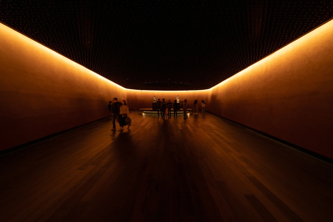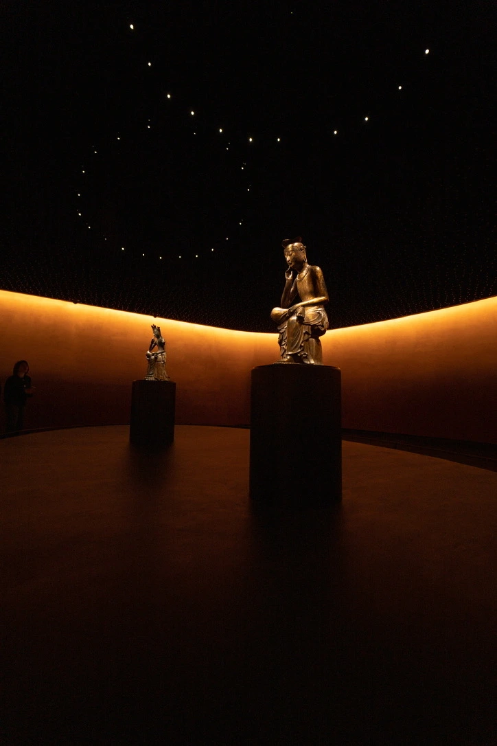 나무 바닥의 약한 경사를 따라 올라가면 끝. 불상은 허리정도 높이의 단 위에 놓여 있다. 천장의 조명은 벽면을 둘러져 빛이 벽을 타고 흐른다. 벽은 황토색으로 전부 칠해져 있다. 천장에는 동그란 철근 같은 것들이 길쭉하게 무수히 박혀있다. 공간은 아무 말도 하지 않지만, 묘하게 많은 말을 하는 것처럼 보인다.